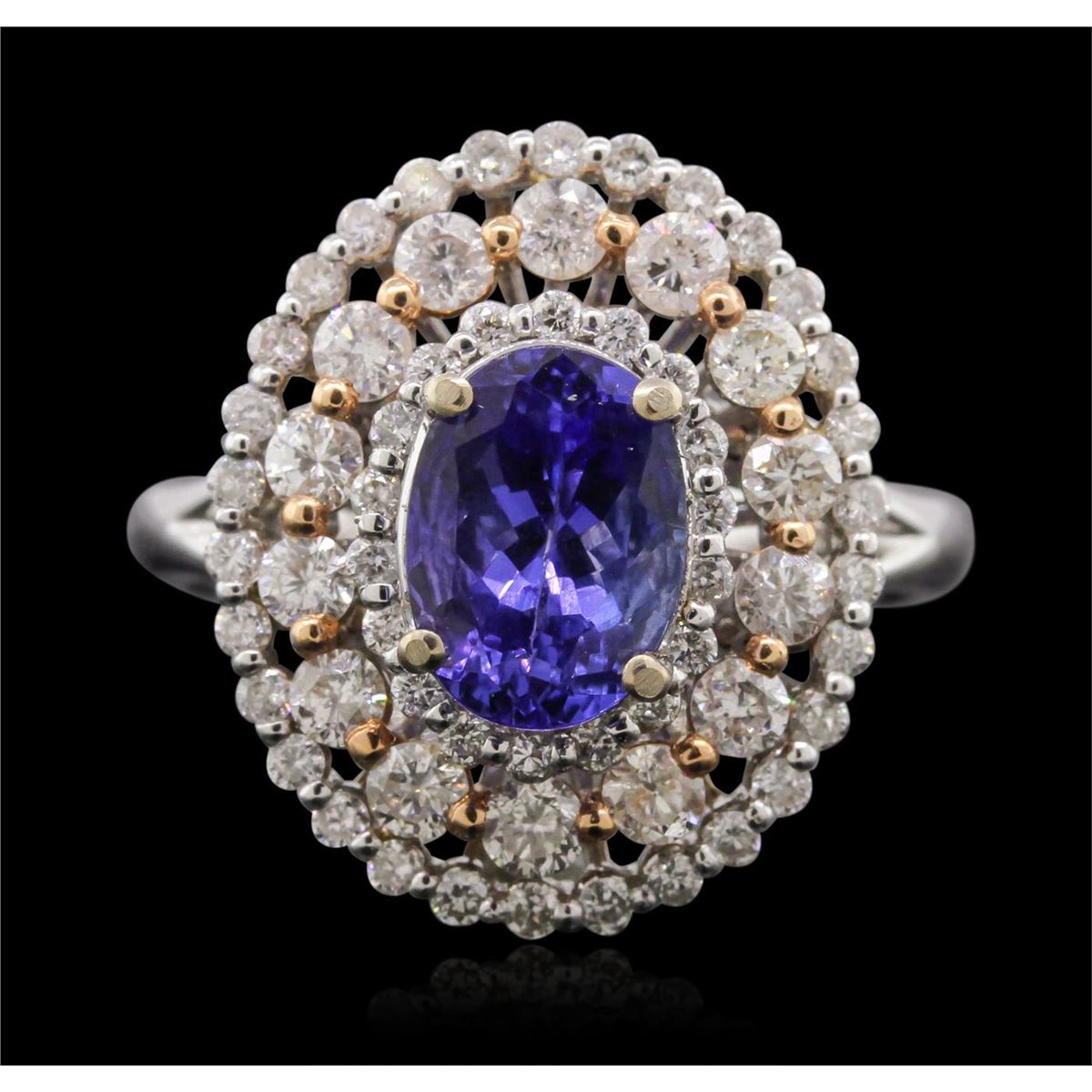 One electronically tested 14KT white and yellow gold Ladies combination cast & assembled ring with a bright polish finish. Condition is new. Identified with markings of "14K". Containing: One prong set oval modified brilliant cut natural tanzanite, measuring 8.60 x 6.40 x 4.60mm, approximate weight of 1.73ct., clarity is eye clean, type I, medium light, very slightly grayish, bluish violet color, (GIA bV 4/3), cut is good. Colored gemstones are presumed to have been subjected to commonly used color/clarity enhancement processes. Fourteen prong set round brilliant cut diamonds, measuring 2.20 - 2.20 x 1.32mm (depth est.) approximate. Total Weight of 14 Stones = 0.55ct. . Clarity: I-1. Color: I - J, Cut is Good. Forty-Eight prong set round brilliant cut diamonds, measuring 1.30 - 1.30 x 0.78mm (depth est.) approximate. Total Weight of 48 Stones = 0.38ct. . Clarity: I-1 to I-2. Color: I - J, Cut is Good. . Total Weight of Colored Stones 1.73ct. Total Weight of Diamonds 0.93ct. Total Weight of Ring 7.70 grams. GGL Appraised at $7,040.00.