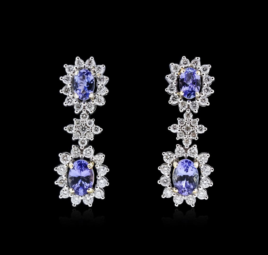 One pair electronically tested 14KT white and yellow gold ladies cast tanzanite and diamond earrings with friction posts with a bright polish finish. Identified with markings of "14K". Condition is new. Containing: Four prong set oval modified brilliant cut natural tanzanites, measuring 6.00 x 4.00 x 2.60mm, approximate total weight of 1.76ct., clarity is eye clean, type I, medium light, very slightly grayish, violet color, (GIA V 4/3), cut is good. Sixty-Six prong set round brilliant cut diamonds, measuring 1.50 - 1.50 x 0.90mm (depth est.) approximate total weight of 66 Stones = 0.81ct. Clarity: SI-1 to SI-2. Color: I - J. Colored gemstones are presumed to have been subjected to commonly used enhancement processes. All diamonds and colored gemstones are graded in the mounting, unless otherwise stated. Total Weight of Colored Stones 1.76ct. Total Weight of Diamonds 0.81ct. Total Weight of Earrings 6.60 grams. GGL Appraised at $5,855.00.