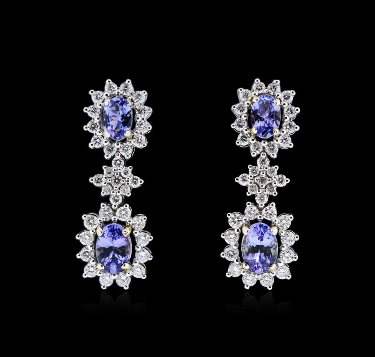 One pair electronically tested 14KT white and yellow gold ladies cast tanzanite and diamond earrings with friction posts with a bright polish finish. Identified with markings of "14K". Condition is new. Containing: Four prong set oval modified brilliant cut natural tanzanites, measuring 6.00 x 4.00 x 2.60mm, approximate total weight of 1.76ct., clarity is eye clean, type I, medium light, very slightly grayish, violet color, (GIA V 4/3), cut is good. Sixty-Six prong set round brilliant cut diamonds, measuring 1.50 - 1.50 x 0.90mm (depth est.) approximate total weight of 66 Stones = 0.81ct. Clarity: SI-1 to SI-2. Color: I - J. Colored gemstones are presumed to have been subjected to commonly used enhancement processes. All diamonds and colored gemstones are graded in the mounting, unless otherwise stated. Total Weight of Colored Stones 1.76ct. Total Weight of Diamonds 0.81ct. Total Weight of Earrings 6.60 grams. GGL Appraised.