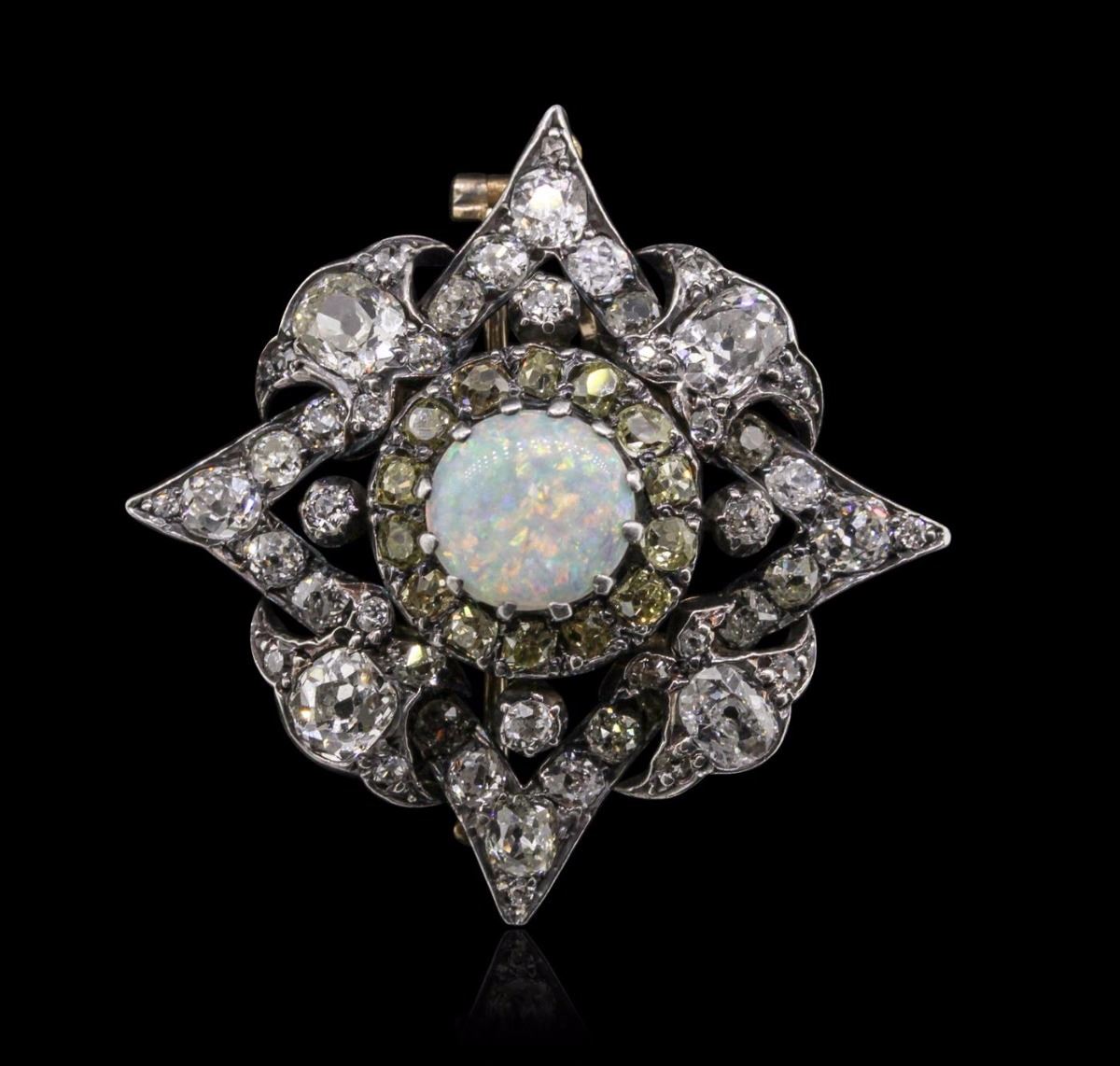 One electronically tested 14KT white and yellow gold ladies hand made brooch with a bright polish finish. Condition is very good. Containing: One white opal that is cut in a round shape and is prong set, measuring 9.20 mm long x 9.20 mm wide, and 3.00 mm thick and the approximate weight is 0.98 carats. The opal has a bright, orange-green play of color (fire) in a pinfire pattern; a low dome; a good cut; no inclusions; consistent in its brightness and pattern; and is somewhat directional. Four prong set old mine cut diamonds, measuring 5.50 - 3.80 x 2.88mm (depth est.) approximate. Total Weight of 4 Stones = 1.52ct. Clarity: I-1. Color: I - J. Forty-One prong set old mine cut diamonds, measuring 2.80 - 2.00 x 1.49mm (depth est.) approximate. Total Weight of 41 Stones = 2.14ct. Clarity: SI-2 to I-1. Color: I - J. Fourteen prong set old mine cut diamonds, measuring 2.00 - 2.00 x 1.24mm (depth est.) approximate. Total Weight of 14 Stones = 0.42ct. Clarity: SI-2 to I-1. All diamonds are graded in the mounting, unless otherwise stated. Total Weight of Diamonds 4.09ct. Total Weight of Opals 0.98ct. Total Weight of Brooch 13.50 grams. GGL Appraised at $14,465.00.