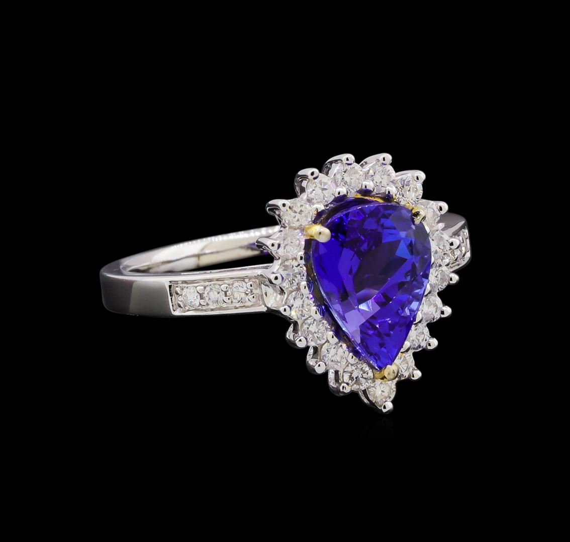 One electronically tested 14KT white and yellow gold ladies combination cast & assembled tanzanite and diamond ring with a flat shank with a bright polish finish. Identified with markings of "14K". Condition is new. Containing: One prong set pear modified brilliant cut natural tanzanite, measuring 9.00 x 7.00 x 4.55mm, approximate weight of 1.92ct., clarity is eye clean, type I, medium light, moderately strong, bluish violet color, (GIA bV 4/4), cut is good. Twenty-Four prong set round brilliant cut diamonds, measuring 1.50 - 1.30 x 0.84mm (depth est.) approximate total weight of 24 Stones = 0.24ct. Clarity: SI-2 to I-1. Color: H - I, Cut is Good. Colored gemstones are presumed to have been subjected to commonly used enhancement processes. All diamonds and colored gemstones are graded in the mounting, unless otherwise stated. Total Weight of Colored Stones 1.92ct. Total Weight of Diamonds 0.24ct. Total Weight of Ring 3.50 grams. GGL Appraised at $4,985.00.