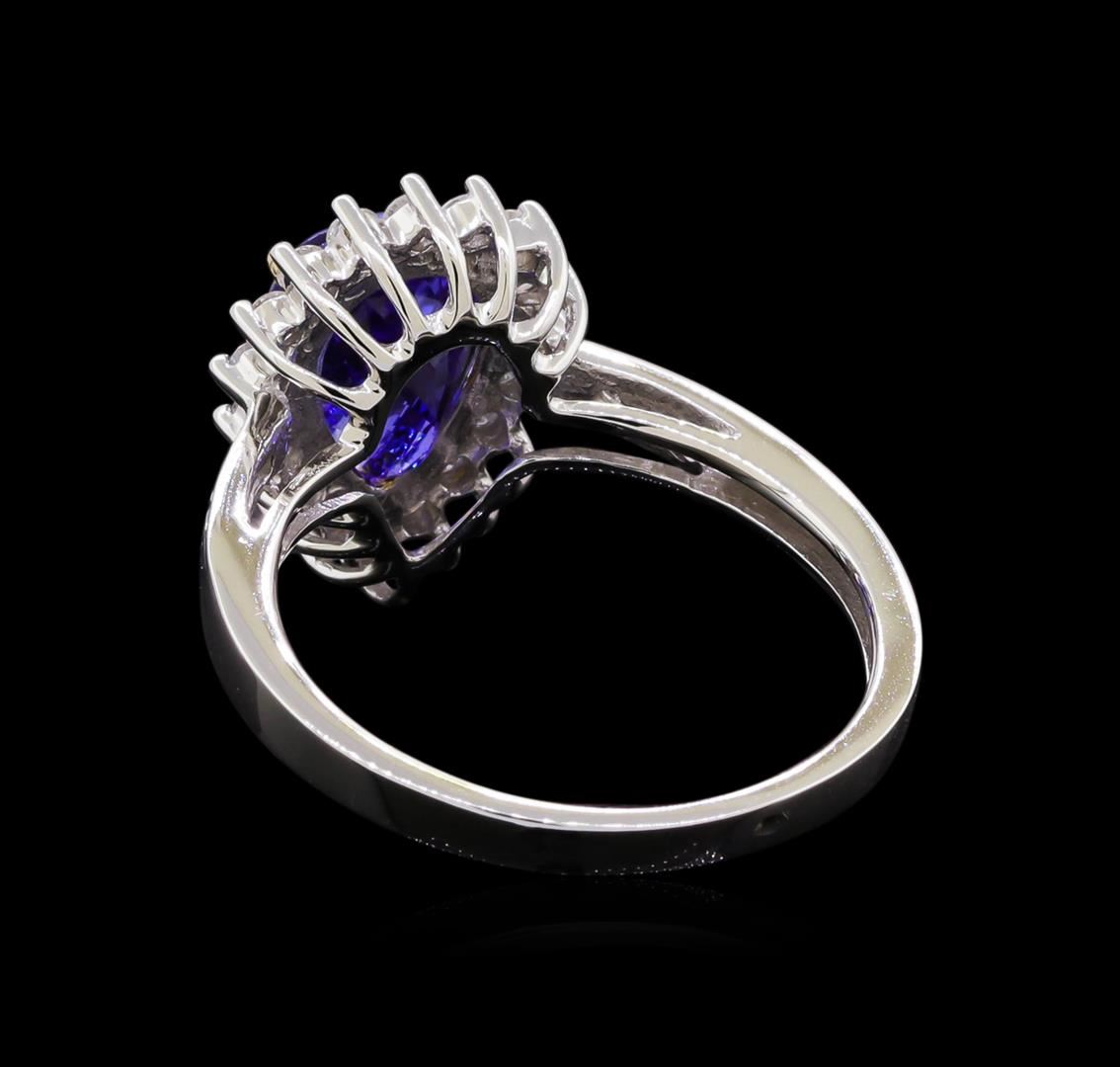 One electronically tested 14KT white and yellow gold ladies combination cast & assembled tanzanite and diamond ring with a flat shank with a bright polish finish. Identified with markings of "14K". Condition is new. Containing: One prong set pear modified brilliant cut natural tanzanite, measuring 9.00 x 7.00 x 4.55mm, approximate weight of 1.92ct., clarity is eye clean, type I, medium light, moderately strong, bluish violet color, (GIA bV 4/4), cut is good. Twenty-Four prong set round brilliant cut diamonds, measuring 1.50 - 1.30 x 0.84mm (depth est.) approximate total weight of 24 Stones = 0.24ct. Clarity: SI-2 to I-1. Color: H - I, Cut is Good. Colored gemstones are presumed to have been subjected to commonly used enhancement processes. All diamonds and colored gemstones are graded in the mounting, unless otherwise stated. Total Weight of Colored Stones 1.92ct. Total Weight of Diamonds 0.24ct. Total Weight of Ring 3.50 grams. GGL Appraised at $4,985.00.