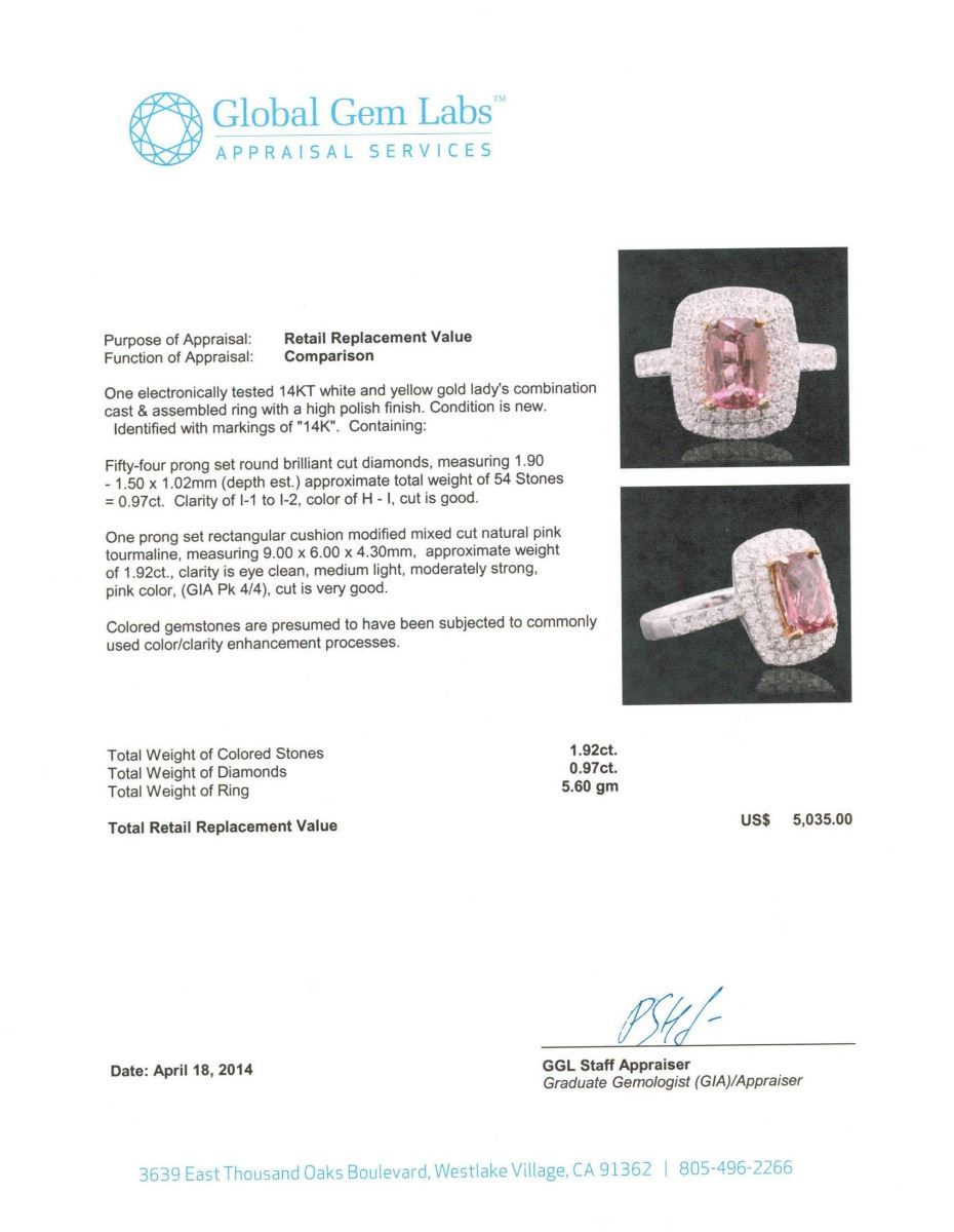 One electronically tested 14KT white and yellow gold Ladies combination cast & assembled ring with a high polish finish. Condition is new. Identified with markings of "14K". Containing: Fifty-Four prong set round brilliant cut diamonds, measuring 1.90 - 1.50 x 1.02mm (depth est.) approximate. Total Weight of 54 Stones = 0.97ct. Clarity: I-1 to I-2. Color: H - I, Cut is Good. One prong set rectangular cushion modified mixed cut natural pink tourmaline, measuring 9.00 x 6.00 x 4.30mm, approximate weight of 1.92ct., clarity is eye clean, medium light, moderately strong, pink color, (GIA Pk 4/4), cut is very good. Colored gemstones are presumed to have been subjected to commonly used color/clarity enhancement processes. Total Weight of Colored Stones 1.92ct. Total Weight of Diamonds 0.97ct. Total Weight of Ring 5.60 grams. GGL Appraised at $5,035.00.