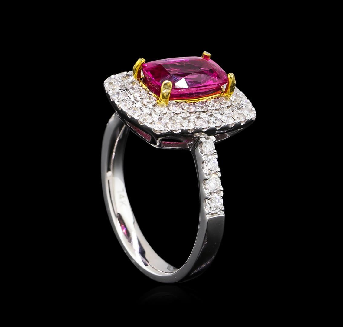 One electronically tested 14KT white and yellow gold Ladies combination cast & assembled ring with a high polish finish. Condition is new. Identified with markings of "14K". Containing: Fifty-Four prong set round brilliant cut diamonds, measuring 1.90 - 1.50 x 1.02mm (depth est.) approximate. Total Weight of 54 Stones = 0.97ct. Clarity: I-1 to I-2. Color: H - I, Cut is Good. One prong set rectangular cushion modified mixed cut natural pink tourmaline, measuring 9.00 x 6.00 x 4.30mm, approximate weight of 1.92ct., clarity is eye clean, medium light, moderately strong, pink color, (GIA Pk 4/4), cut is very good. Colored gemstones are presumed to have been subjected to commonly used color/clarity enhancement processes. Total Weight of Colored Stones 1.92ct. Total Weight of Diamonds 0.97ct. Total Weight of Ring 5.60 grams. GGL Appraised at $5,035.00.