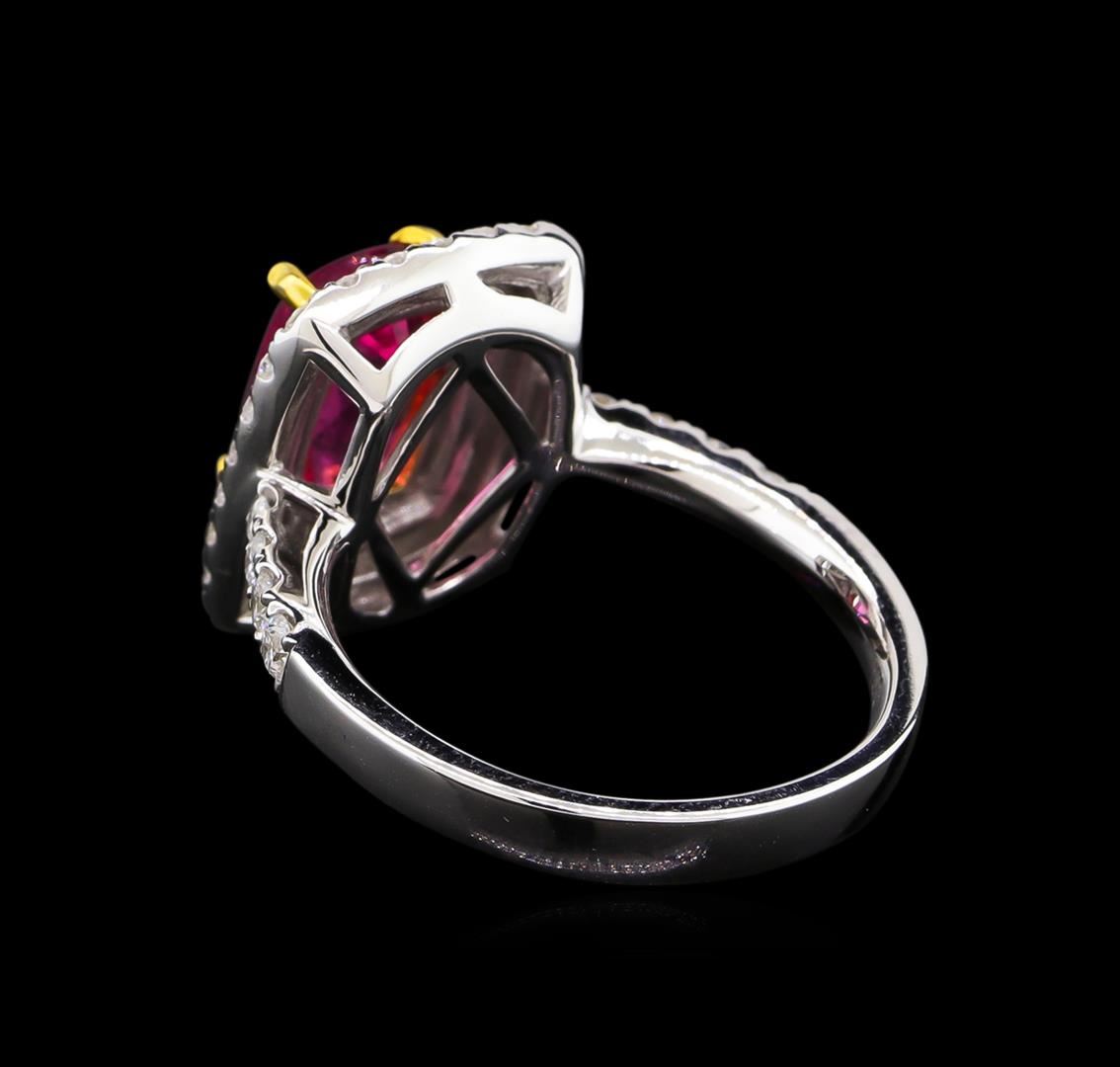 One electronically tested 14KT white and yellow gold Ladies combination cast & assembled ring with a high polish finish. Condition is new. Identified with markings of "14K". Containing: Fifty-Four prong set round brilliant cut diamonds, measuring 1.90 - 1.50 x 1.02mm (depth est.) approximate. Total Weight of 54 Stones = 0.97ct. Clarity: I-1 to I-2. Color: H - I, Cut is Good. One prong set rectangular cushion modified mixed cut natural pink tourmaline, measuring 9.00 x 6.00 x 4.30mm, approximate weight of 1.92ct., clarity is eye clean, medium light, moderately strong, pink color, (GIA Pk 4/4), cut is very good. Colored gemstones are presumed to have been subjected to commonly used color/clarity enhancement processes. Total Weight of Colored Stones 1.92ct. Total Weight of Diamonds 0.97ct. Total Weight of Ring 5.60 grams. GGL Appraised at $5,035.00.