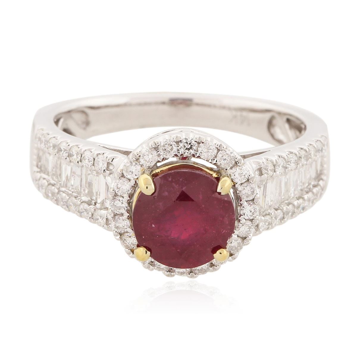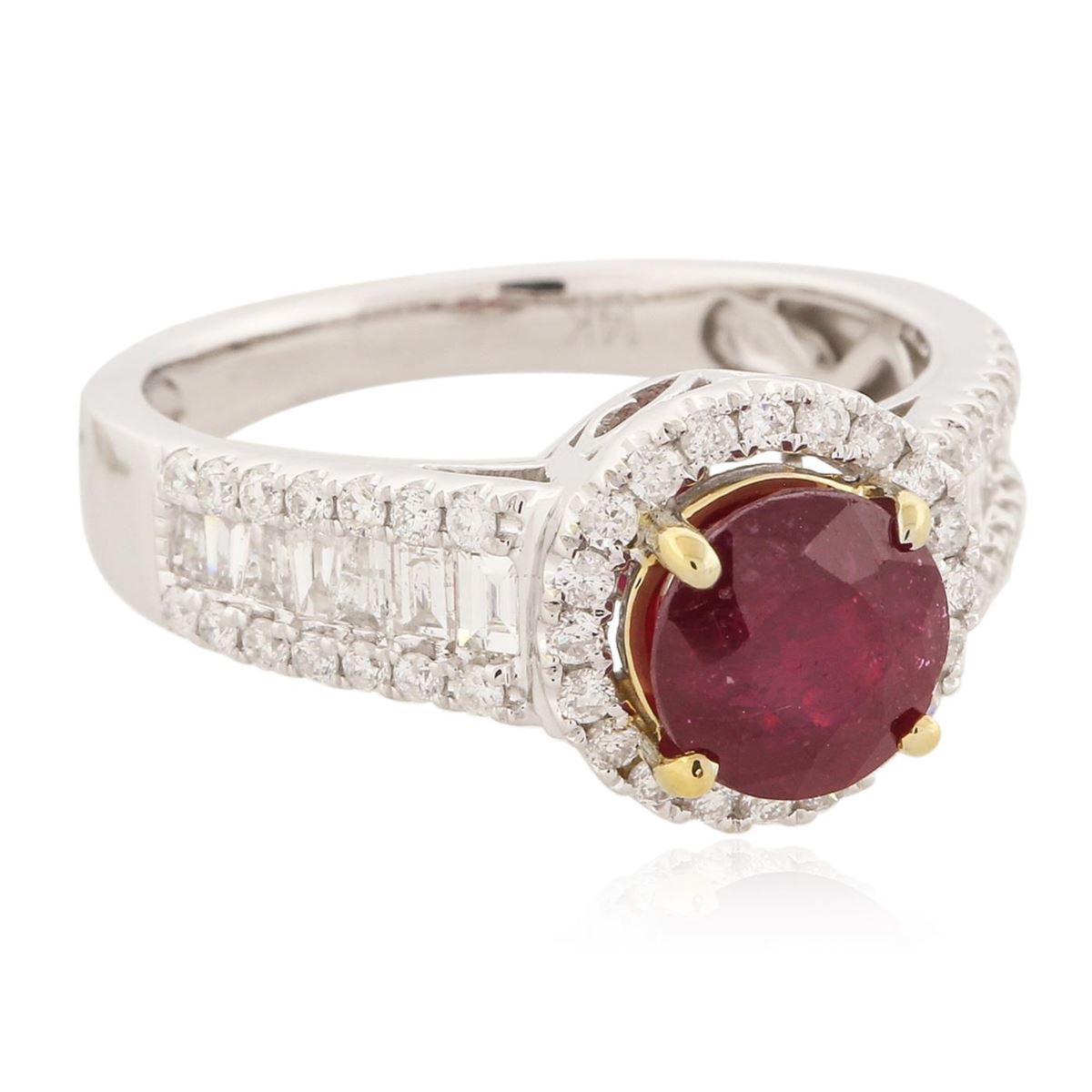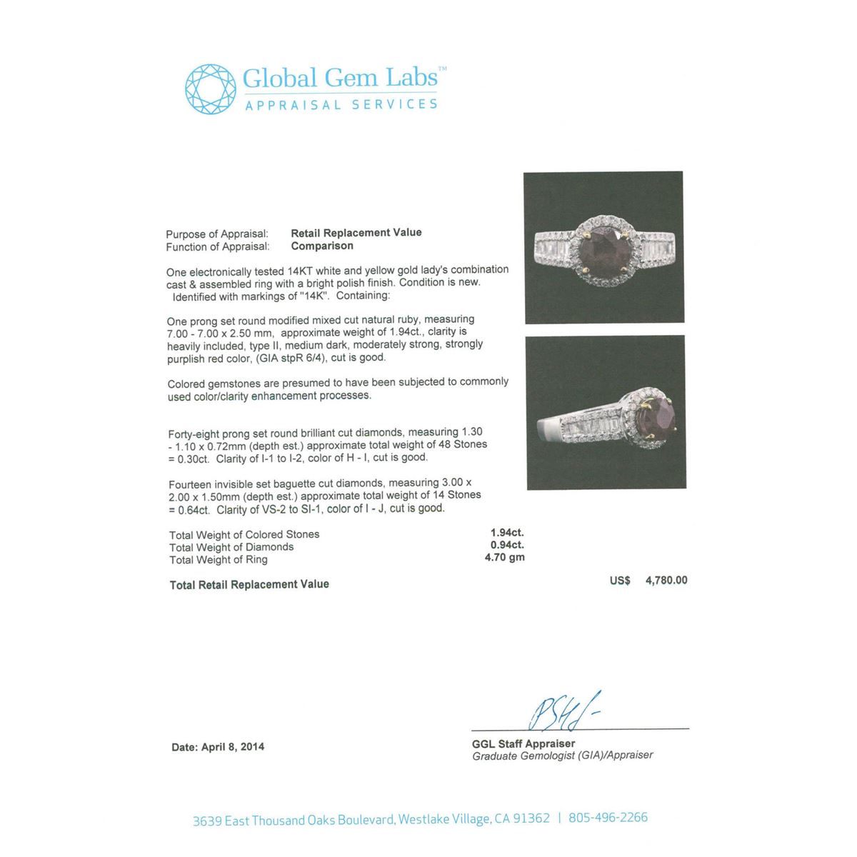 One electronically tested 14KT white and yellow gold Ladies combination cast & assembled ring with a bright polish finish. Condition is new. Identified with markings of "14K". Containing: One prong set round modified mixed cut natural ruby, measuring 7.00 - 7.00 x 2.50 mm, approximate weight of 1.94ct., clarity is heavily included, type II, medium dark, moderately strong, strongly purplish red color, (GIA stpR 6/4), cut is good. Colored gemstones are presumed to have been subjected to commonly used color/clarity enhancement processes. Forty-Eight prong set round brilliant cut diamonds, measuring 1.30 - 1.10 x 0.72mm (depth est.) approximate. Total Weight of 48 Stones = 0.30ct. Clarity: I-1 to I-2. Color: H - I, Cut is Good. Fourteen invisible set baguette cut diamonds, measuring 3.00 x 2.00 x 1.50mm (depth est.) approximate. Total Weight of 14 Stones = 0.64ct. Clarity: VS-2 to SI-1. Color: I - J, Cut is Good. Total Weight of Colored Stones 1.94ct. Total Weight of Diamonds 0.94ct. Total Weight of Ring 4.70 grams. GGL Appraised at $4,780.00.