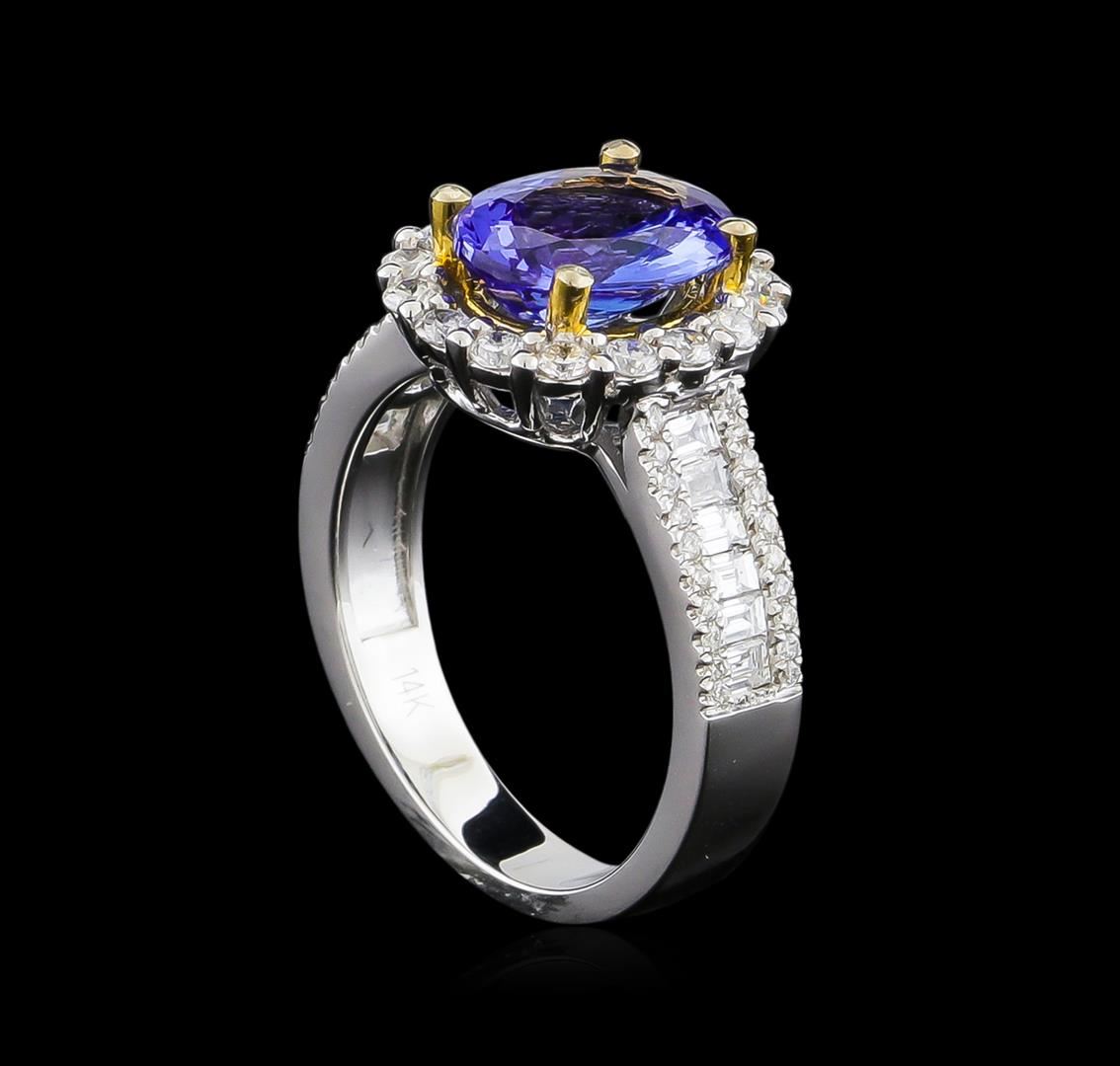 One electronically tested 14KT white and yellow gold ladies combination cast & assembled tanzanite and diamond ring with a flat shank with a bright polish finish. Identified with markings of "14K". Condition is new. Containing: One prong set oval modified brilliant cut natural tanzanite, measuring 10.09 x 7.84 x 3.65mm, approximate weight of 1.97ct., clarity is eye clean, type I, medium, very slightly grayish, violet color, (GIA V 5/3), cut is good. Fifty-Six prong set round brilliant cut diamonds, measuring 1.70 - 1.10 x 0.84mm (depth est.) approximate total weight of 56 Stones = 0.56ct. Clarity: SI-2 to I-2. Color: I - J, Cut is Good. Twelve channel set baguette cut diamonds, measuring 2.00 x 1.50 x 1.28mm (depth est.) approximate total weight of 12 Stones = 0.42ct. Clarity: SI-1. Color: I - J, Cut is Good. Colored gemstones are presumed to have been subjected to commonly used enhancement processes. All diamonds and colored gemstones are graded in the mounting, unless otherwise stated total weight of Colored Stones 1.97ct. Total Weight of Diamonds 0.98ct. Total Weight of Ring 5.80 grams. GGL Appraised at $7,365.00.