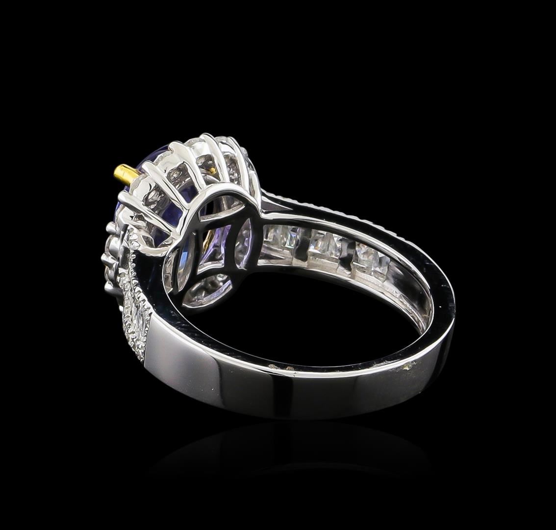 One electronically tested 14KT white and yellow gold ladies combination cast & assembled tanzanite and diamond ring with a flat shank with a bright polish finish. Identified with markings of "14K". Condition is new. Containing: One prong set oval modified brilliant cut natural tanzanite, measuring 10.09 x 7.84 x 3.65mm, approximate weight of 1.97ct., clarity is eye clean, type I, medium, very slightly grayish, violet color, (GIA V 5/3), cut is good. Fifty-Six prong set round brilliant cut diamonds, measuring 1.70 - 1.10 x 0.84mm (depth est.) approximate total weight of 56 Stones = 0.56ct. Clarity: SI-2 to I-2. Color: I - J, Cut is Good. Twelve channel set baguette cut diamonds, measuring 2.00 x 1.50 x 1.28mm (depth est.) approximate total weight of 12 Stones = 0.42ct. Clarity: SI-1. Color: I - J, Cut is Good. Colored gemstones are presumed to have been subjected to commonly used enhancement processes. All diamonds and colored gemstones are graded in the mounting, unless otherwise stated total weight of Colored Stones 1.97ct. Total Weight of Diamonds 0.98ct. Total Weight of Ring 5.80 grams. GGL Appraised at $7,365.00.