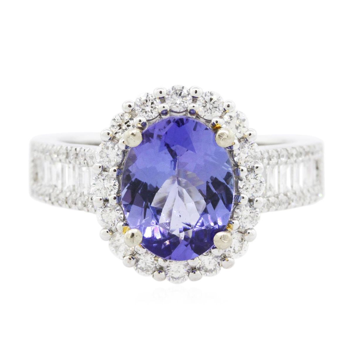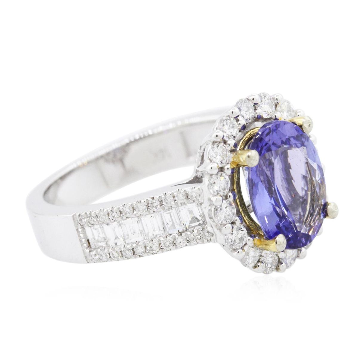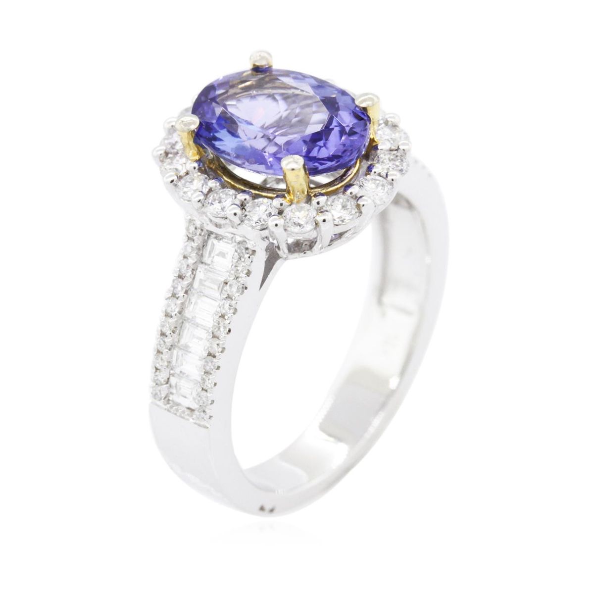 One electronically tested 14KT white and yellow gold ladies combination cast & assembled tanzanite and diamond ring with a flat shank with a bright polish finish. Identified with markings of "14K". Condition is new. Containing: One prong set oval modified brilliant cut natural tanzanite, measuring 10.09 x 7.84 x 3.65mm, approximate weight of 1.97ct., clarity is eye clean, type I, medium, very slightly grayish, violet color, (GIA V 5/3), cut is good. Fifty-Six prong set round brilliant cut diamonds, measuring 1.70 - 1.10 x 0.84mm (depth est.) approximate total weight of 56 Stones = 0.56ct. Clarity: SI-2 to I-2. Color: I - J, Cut is Good. Twelve channel set baguette cut diamonds, measuring 2.00 x 1.50 x 1.28mm (depth est.) approximate total weight of 12 Stones = 0.42ct. Clarity: SI-1. Color: I - J, Cut is Good. Colored gemstones are presumed to have been subjected to commonly used enhancement processes. All diamonds and colored gemstones are graded in the mounting, unless otherwise stated total weight of Colored Stones 1.97ct. Total Weight of Diamonds 0.98ct. Total Weight of Ring 5.80 grams. GGL Appraised at $7,365.00.