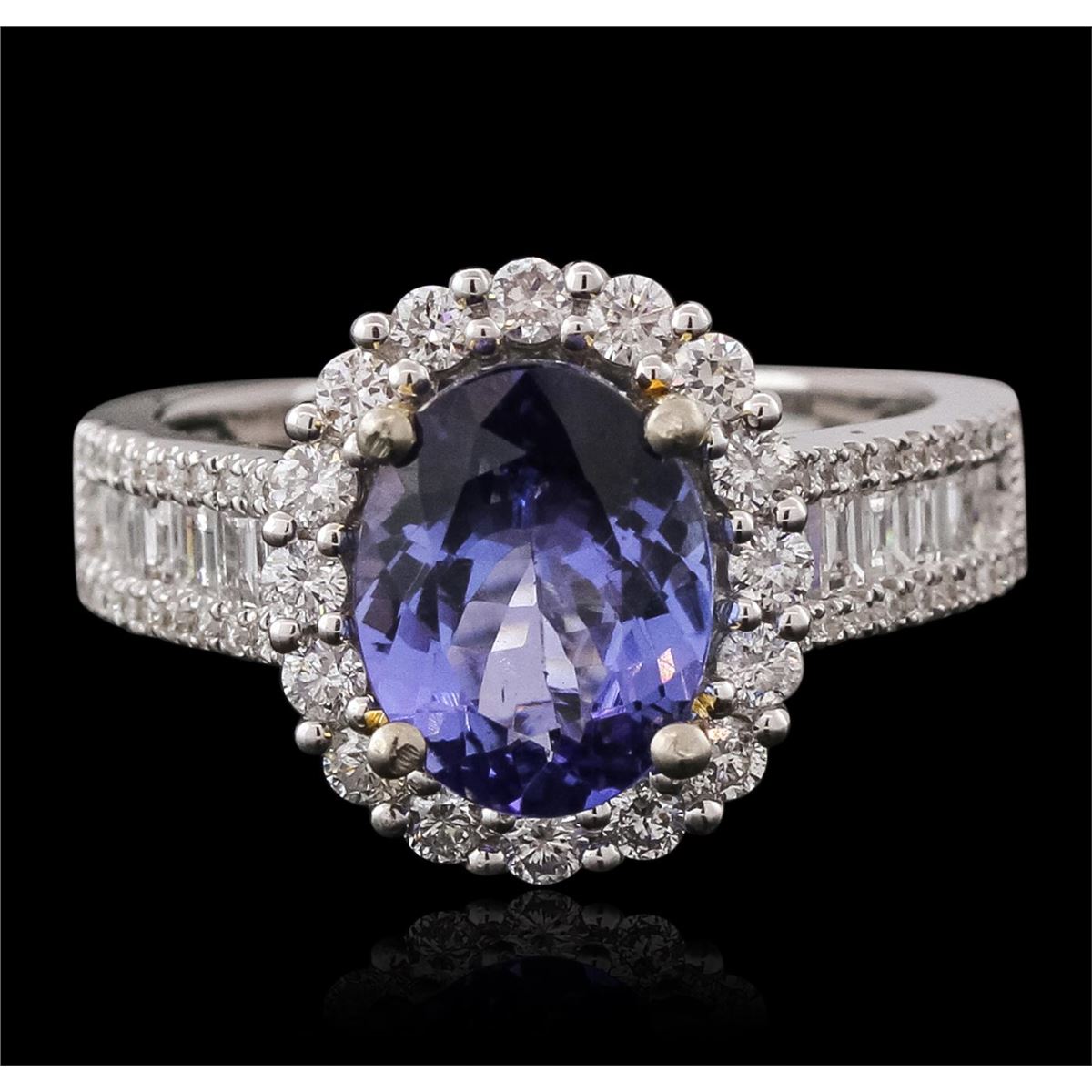 One electronically tested 14KT white and yellow gold ladies combination cast & assembled tanzanite and diamond ring with a flat shank with a bright polish finish. Identified with markings of "14K". Condition is new. Containing: One prong set oval modified brilliant cut natural tanzanite, measuring 10.09 x 7.84 x 3.65mm, approximate weight of 1.97ct., clarity is eye clean, type I, medium, very slightly grayish, violet color, (GIA V 5/3), cut is good. Fifty-Six prong set round brilliant cut diamonds, measuring 1.70 - 1.10 x 0.84mm (depth est.) approximate total weight of 56 Stones = 0.56ct. Clarity: SI-2 to I-2. Color: I - J, Cut is Good. Twelve channel set baguette cut diamonds, measuring 2.00 x 1.50 x 1.28mm (depth est.) approximate total weight of 12 Stones = 0.42ct. Clarity: SI-1. Color: I - J, Cut is Good. Colored gemstones are presumed to have been subjected to commonly used enhancement processes. All diamonds and colored gemstones are graded in the mounting, unless otherwise stated total weight of Colored Stones 1.97ct. Total Weight of Diamonds 0.98ct. Total Weight of Ring 5.80 grams. GGL Appraised at $7,365.00.