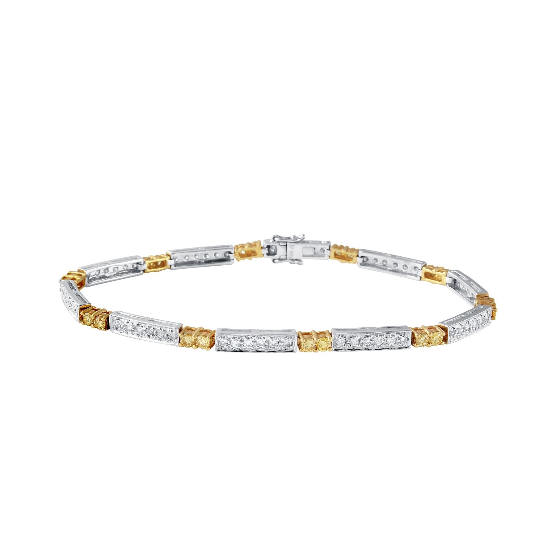 14KT Two Tone Gold 1.97ctw Yellow Diamond Bracelet. (20) Round Yellow Diamonds with a total weight of 1.11cts with a clarity of SI-2. (59) Round white Diamonds with a total weight of 0.86cts with a color of I and clarity of I-1. Total length of this bracelet is 7 inches. Total weight of this bracelet is 8.69 grams.