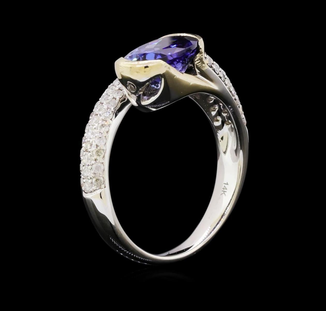 One electronically tested 14KT white and yellow gold ladies combination cast & assembled tanzanite and diamond ring with a flat shank with a bright polish finish. Identified with markings of "14K". Condition is new. Containing: One prong set oval modified brilliant cut natural tanzanite, measuring 9.84 x 6.84 x 4.27mm, approximate weight of 1.99ct., clarity is eye clean, type I, medium, moderately strong, violet color, (GIA V 5/4), cut is good. Eighty-Two prong set round brilliant cut diamonds, measuring 1.00 - 1.00 x 0.60mm (depth est.) approximate total weight of 82 Stones = 0.30ct. Clarity: I-1 to I-2. Color: I - J, Cut is Good. Colored gemstones are presumed to have been subjected to commonly used enhancement processes. All diamonds and colored gemstones are graded in the mounting, unless otherwise stated. Total Weight of Colored Stones 1.99ct. Total Weight of Diamonds 0.30ct. Total Weight of Ring 4.80 grams. GGL Appraised.