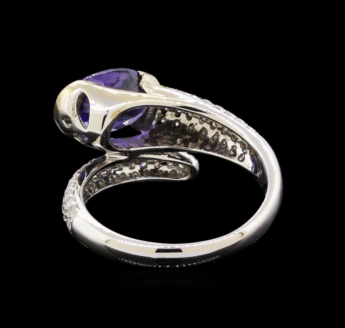 One electronically tested 14KT white and yellow gold ladies combination cast & assembled tanzanite and diamond ring with a flat shank with a bright polish finish. Identified with markings of "14K". Condition is new. Containing: One prong set oval modified brilliant cut natural tanzanite, measuring 9.84 x 6.84 x 4.27mm, approximate weight of 1.99ct., clarity is eye clean, type I, medium, moderately strong, violet color, (GIA V 5/4), cut is good. Eighty-Two prong set round brilliant cut diamonds, measuring 1.00 - 1.00 x 0.60mm (depth est.) approximate total weight of 82 Stones = 0.30ct. Clarity: I-1 to I-2. Color: I - J, Cut is Good. Colored gemstones are presumed to have been subjected to commonly used enhancement processes. All diamonds and colored gemstones are graded in the mounting, unless otherwise stated. Total Weight of Colored Stones 1.99ct. Total Weight of Diamonds 0.30ct. Total Weight of Ring 4.80 grams. GGL Appraised.