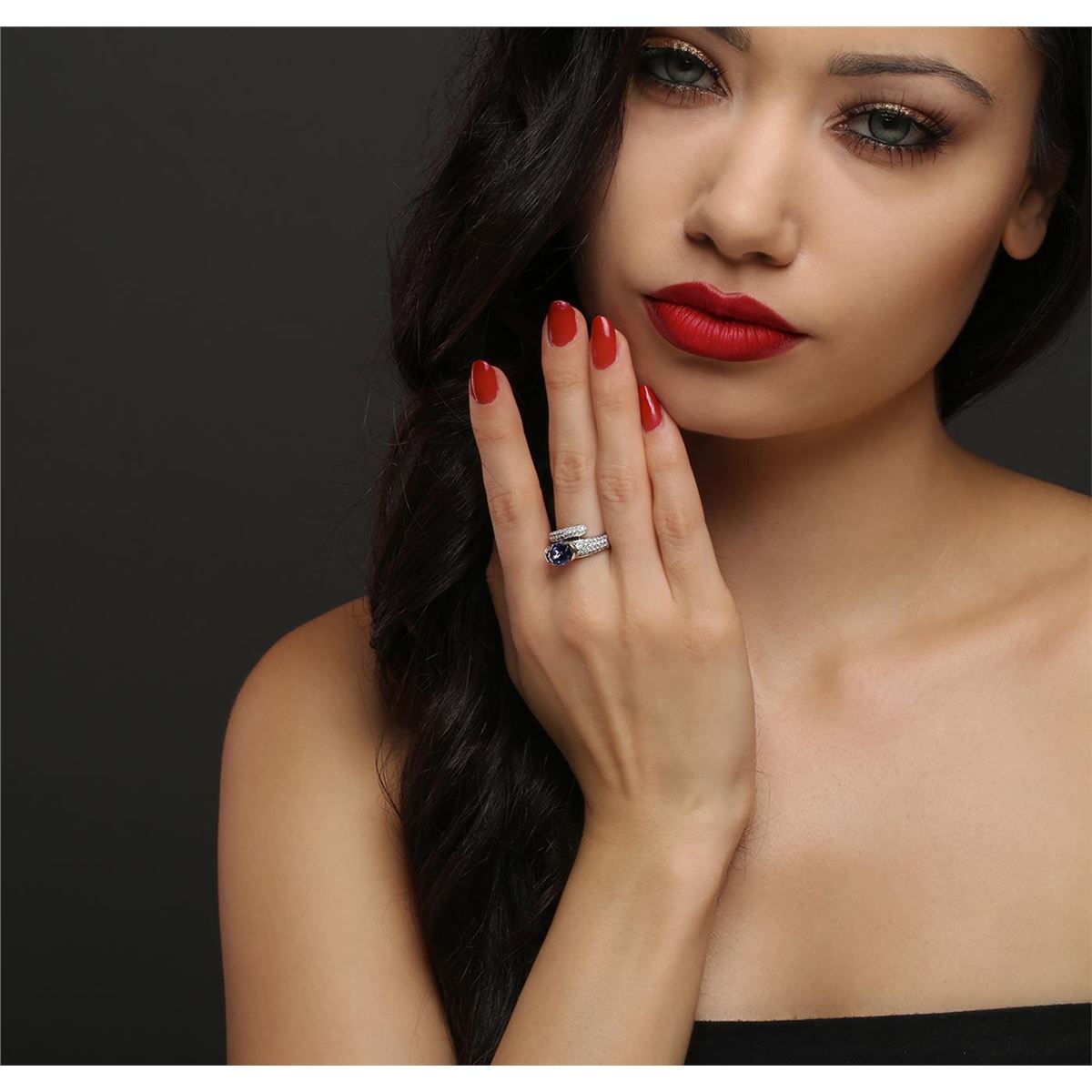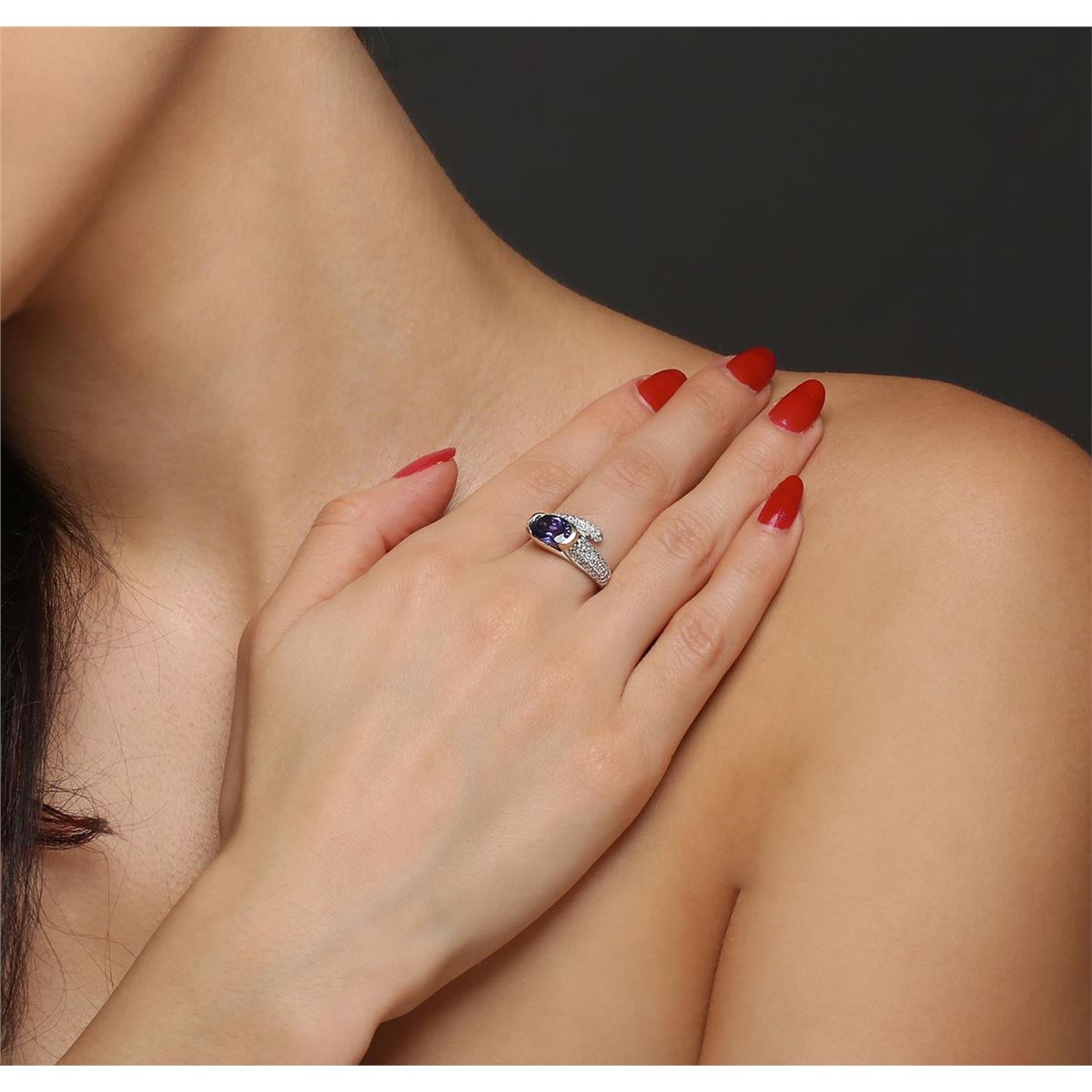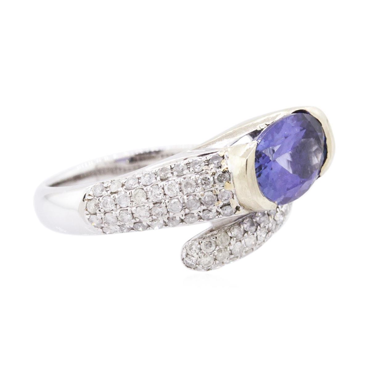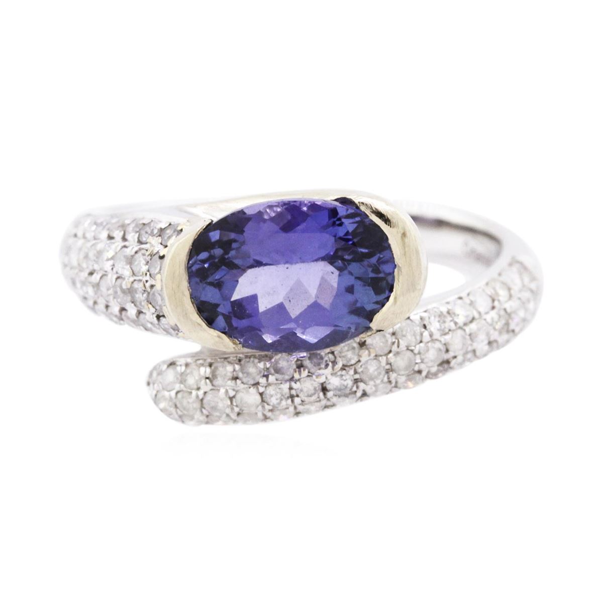 One electronically tested 14KT white and yellow gold ladies combination cast & assembled tanzanite and diamond ring with a flat shank with a bright polish finish. Identified with markings of "14K". Condition is new. Containing: One prong set oval modified brilliant cut natural tanzanite, measuring 9.84 x 6.84 x 4.27mm, approximate weight of 1.99ct., clarity is eye clean, type I, medium, moderately strong, violet color, (GIA V 5/4), cut is good. Eighty-Two prong set round brilliant cut diamonds, measuring 1.00 - 1.00 x 0.60mm (depth est.) approximate total weight of 82 Stones = 0.30ct. Clarity: I-1 to I-2. Color: I - J, Cut is Good. Colored gemstones are presumed to have been subjected to commonly used enhancement processes. All diamonds and colored gemstones are graded in the mounting, unless otherwise stated. Total Weight of Colored Stones 1.99ct. Total Weight of Diamonds 0.30ct. Total Weight of Ring 4.80 grams. GGL Appraised at $5,175.00.