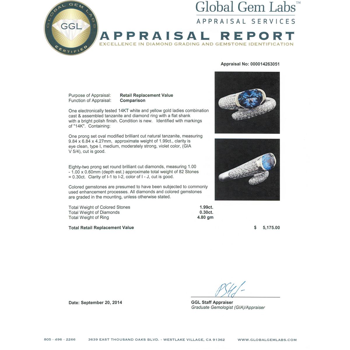One electronically tested 14KT white and yellow gold ladies combination cast & assembled tanzanite and diamond ring with a flat shank with a bright polish finish. Identified with markings of "14K". Condition is new. Containing: One prong set oval modified brilliant cut natural tanzanite, measuring 9.84 x 6.84 x 4.27mm, approximate weight of 1.99ct., clarity is eye clean, type I, medium, moderately strong, violet color, (GIA V 5/4), cut is good. Eighty-Two prong set round brilliant cut diamonds, measuring 1.00 - 1.00 x 0.60mm (depth est.) approximate total weight of 82 Stones = 0.30ct. Clarity: I-1 to I-2. Color: I - J, Cut is Good. Colored gemstones are presumed to have been subjected to commonly used enhancement processes. All diamonds and colored gemstones are graded in the mounting, unless otherwise stated. Total Weight of Colored Stones 1.99ct. Total Weight of Diamonds 0.30ct. Total Weight of Ring 4.80 grams. GGL Appraised at $5,175.00.