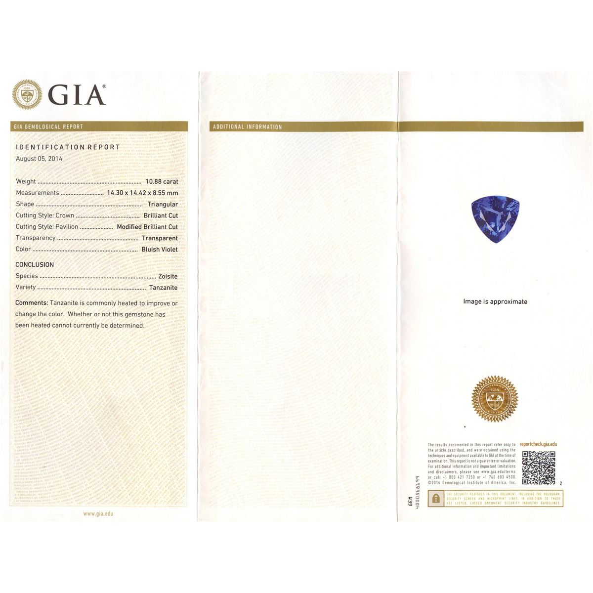 One electronically tested 14KT white and yellow gold ladies combination cast & assembled pendant & necklace with a lobster claw clasp with a bright polish finish. Necklace: 12" in length. Identified with markings of "14K". Condition is new. Containing: One prong set triangle modified brilliant cut natural tanzanite, measuring 14.30 x 14.42 x 8.55mm, approximate weight of 10.88ct., clarity is eye clean, type I, medium, moderately strong, bluish violet color, (GIA bV 5/4), cut is very good. Graded loose prior to setting by GIA Gemological Laboratory. GIA Report: #1166453352. Sixty channel set baguette cut diamonds, measuring from 2.00 x 1.50 x 1.28mm (depth est.) to 4.00 x 1.50 x 1.28mm (depth est.) approximate total weight of 60 Stones = 6.12ct. Clarity: VS-1 to VS-2. Color: H - I, Cut is Good. One Hundred prong set round brilliant cut diamonds, measuring 2.00 - 1.50 x 1.05mm (depth est.) approximate total weight of 100 Stones = 1.10ct. Clarity: SI-1 to SI-2. Color: G - H, Cut is Good. Colored gemstones are presumed to have been subjected to commonly used enhancement processes. All diamonds and colored gemstones are graded in the mounting, unless otherwise stated. Total Weight of Colored Stones 10.88ct. Total Weight of Diamonds 7.22ct. Total Weight of Pendant & Necklace 24.90 grams. GGL Appraised at $45,590.00.