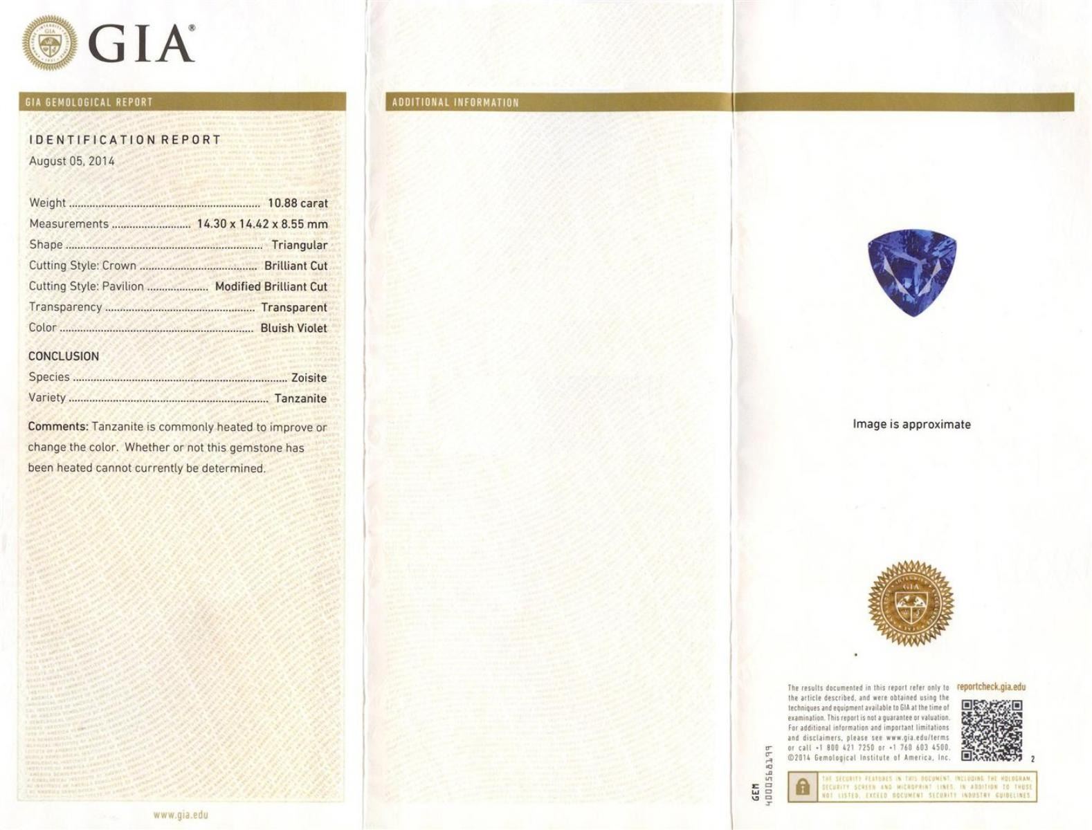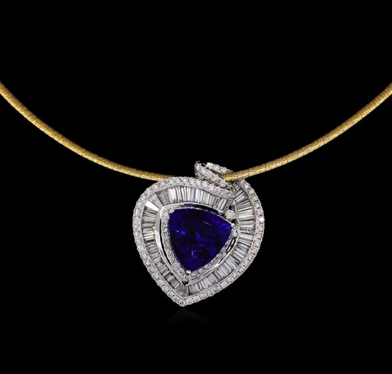 One electronically tested 14KT white and yellow gold ladies combination cast & assembled pendant & necklace with a lobster claw clasp with a bright polish finish. Necklace: 12" in length. Identified with markings of "14K". Condition is new. Containing: One prong set triangle modified brilliant cut natural tanzanite, measuring 14.30 x 14.42 x 8.55mm, approximate weight of 10.88ct., clarity is eye clean, type I, medium, moderately strong, bluish violet color, (GIA bV 5/4), cut is very good. Graded loose prior to setting by GIA Gemological Laboratory. GIA Report: #1166453352. Sixty channel set baguette cut diamonds, measuring from 2.00 x 1.50 x 1.28mm (depth est.) to 4.00 x 1.50 x 1.28mm (depth est.) approximate total weight of 60 Stones = 6.12ct. Clarity: VS-1 to VS-2. Color: H - I, Cut is Good. One Hundred prong set round brilliant cut diamonds, measuring 2.00 - 1.50 x 1.05mm (depth est.) approximate total weight of 100 Stones = 1.10ct. Clarity: SI-1 to SI-2. Color: G - H, Cut is Good. Colored gemstones are presumed to have been subjected to commonly used enhancement processes. All diamonds and colored gemstones are graded in the mounting, unless otherwise stated. Total Weight of Colored Stones 10.88ct. Total Weight of Diamonds 7.22ct. Total Weight of Pendant & Necklace 24.90 grams. GGL Appraised.