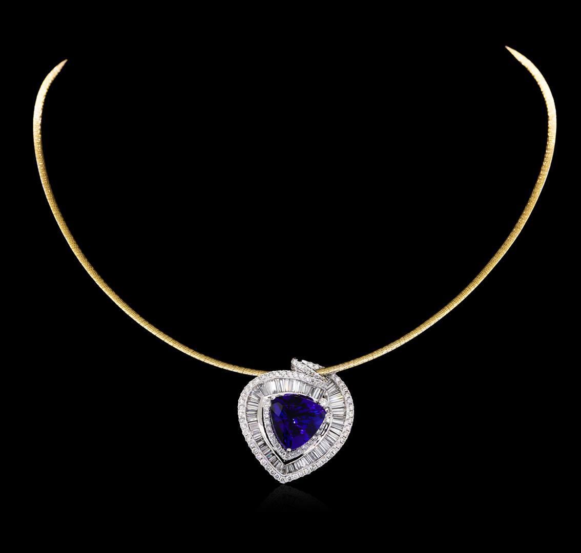 One electronically tested 14KT white and yellow gold ladies combination cast & assembled pendant & necklace with a lobster claw clasp with a bright polish finish. Necklace: 12" in length. Identified with markings of "14K". Condition is new. Containing: One prong set triangle modified brilliant cut natural tanzanite, measuring 14.30 x 14.42 x 8.55mm, approximate weight of 10.88ct., clarity is eye clean, type I, medium, moderately strong, bluish violet color, (GIA bV 5/4), cut is very good. Graded loose prior to setting by GIA Gemological Laboratory. GIA Report: #1166453352. Sixty channel set baguette cut diamonds, measuring from 2.00 x 1.50 x 1.28mm (depth est.) to 4.00 x 1.50 x 1.28mm (depth est.) approximate total weight of 60 Stones = 6.12ct. Clarity: VS-1 to VS-2. Color: H - I, Cut is Good. One Hundred prong set round brilliant cut diamonds, measuring 2.00 - 1.50 x 1.05mm (depth est.) approximate total weight of 100 Stones = 1.10 ct. Clarity: SI-1 to SI-2. Color: G - H, Cut is Good. Colored gemstones are presumed to have been subjected to commonly used enhancement processes. All diamonds and colored gemstones are graded in the mounting, unless otherwise stated. Total Weight of Colored Stones 10.88ct. Total Weight of Diamonds 7.22ct. Total Weight of Pendant & Necklace 24.90 grams. GGL Appraised.