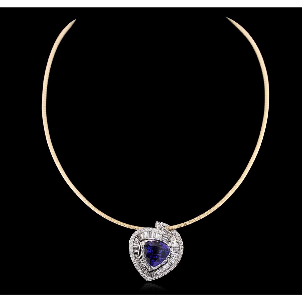 One electronically tested 14KT white and yellow gold ladies combination cast & assembled pendant & necklace with a lobster claw clasp with a bright polish finish. Necklace: 12" in length. Identified with markings of "14K". Condition is new. Containing: One prong set triangle modified brilliant cut natural tanzanite, measuring 14.30 x 14.42 x 8.55mm, approximate weight of 10.88ct., clarity is eye clean, type I, medium, moderately strong, bluish violet color, (GIA bV 5/4), cut is very good. Graded loose prior to setting by GIA Gemological Laboratory. GIA Report: #1166453352. Sixty channel set baguette cut diamonds, measuring from 2.00 x 1.50 x 1.28mm (depth est.) to 4.00 x 1.50 x 1.28mm (depth est.) approximate total weight of 60 Stones = 6.12ct. Clarity: VS-1 to VS-2. Color: H - I, Cut is Good. One Hundred prong set round brilliant cut diamonds, measuring 2.00 - 1.50 x 1.05mm (depth est.) approximate total weight of 100 Stones = 1.10ct. Clarity: SI-1 to SI-2. Color: G - H, Cut is Good. Colored gemstones are presumed to have been subjected to commonly used enhancement processes. All diamonds and colored gemstones are graded in the mounting, unless otherwise stated. Total Weight of Colored Stones 10.88ct. Total Weight of Diamonds 7.22ct. Total Weight of Pendant & Necklace 24.90 grams. GGL Appraised at $45,590.00.