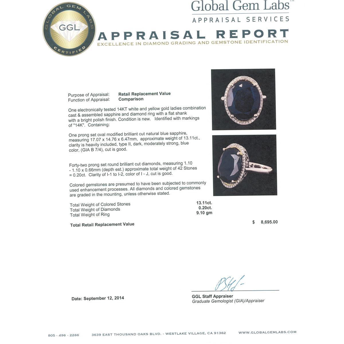 One electronically tested 14KT white and yellow gold ladies combination cast & assembled sapphire and diamond ring with a flat shank with a bright polish finish. Identified with markings of "14K". Condition is new. Containing: One prong set oval modified brilliant cut natural blue sapphire, measuring 17.07 x 14.76 x 6.47mm, approximate weight of 13.11ct., clarity is heavily included, type II, dark, moderately strong, blue color, (GIA B 7/4), cut is good. Forty-Two prong set round brilliant cut diamonds, measuring 1.10 - 1.10 x 0.66mm (depth est.) approximate total weight of 42 Stones = 0.20ct. Clarity: I-1 to I-2. Color: I - J, Cut is Good. Colored gemstones are presumed to have been subjected to commonly used enhancement processes. All diamonds and colored gemstones are graded in the mounting, unless otherwise stated total weight of Colored Stones 13.11ct. Total Weight of Diamonds 0.20ct. Total Weight of Ring 9.10 grams. GGL Appraised at $8,695.00.
