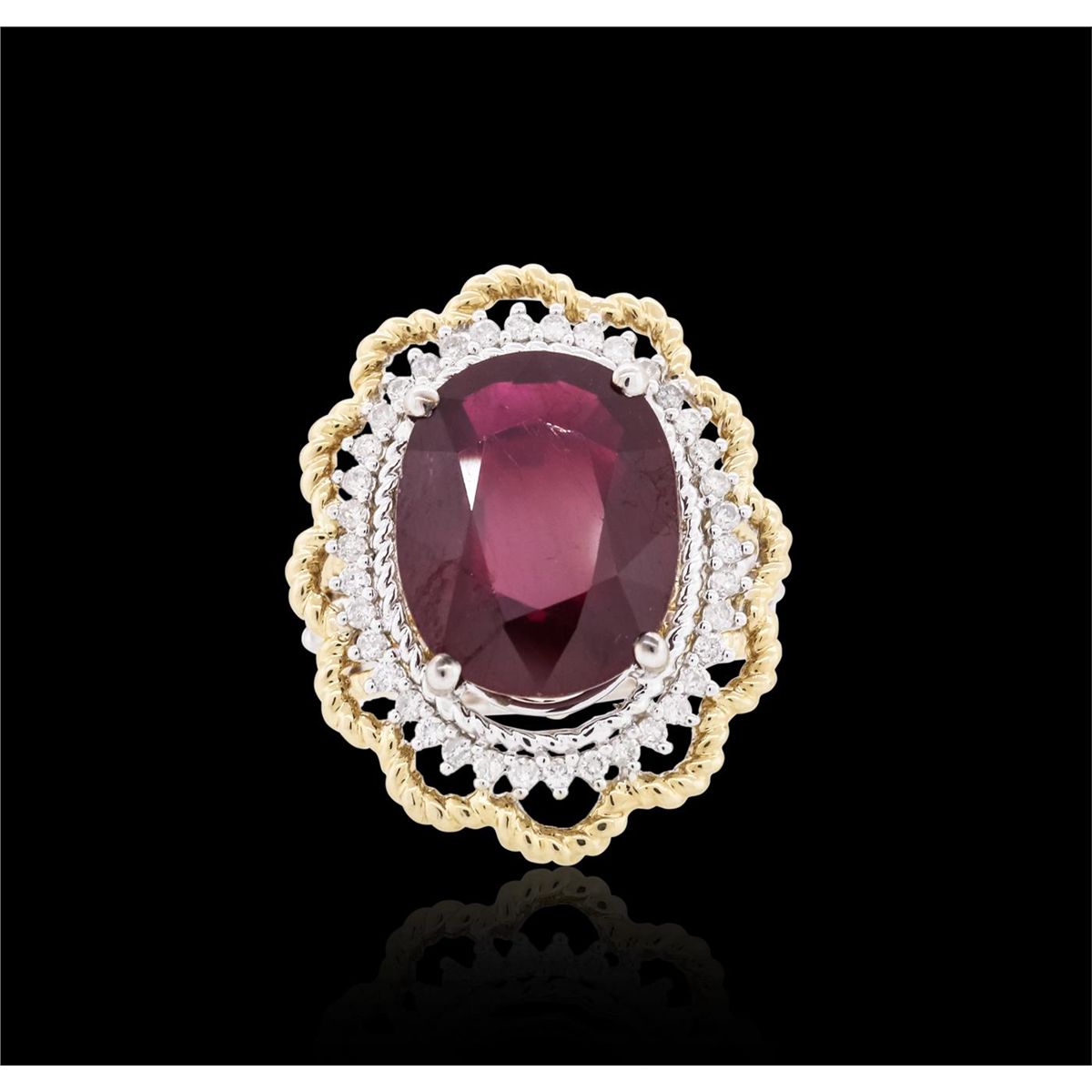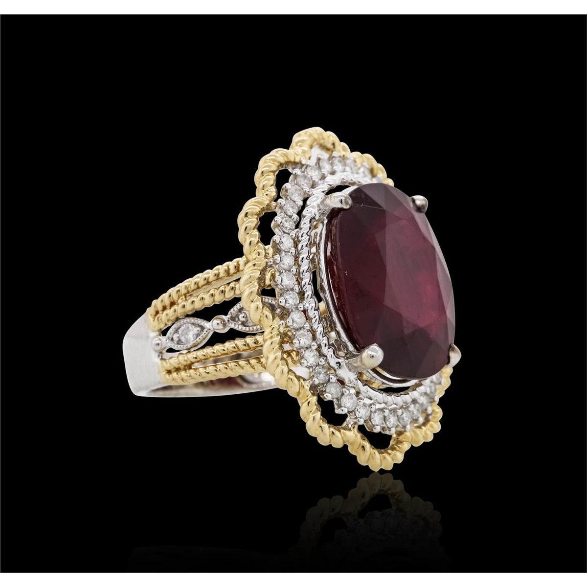 One ring featuring: 14KT white and yellow gold weighing 9.10 grams containing one ruby center stone with a total weight of 13.13ct and 42 round cut diamonds with a total weight of 0.50cts.