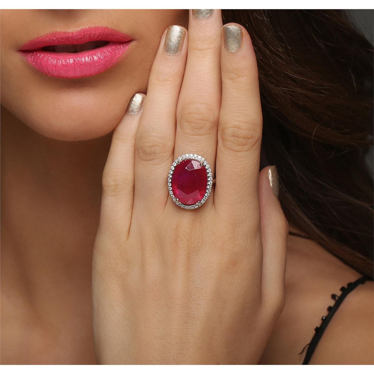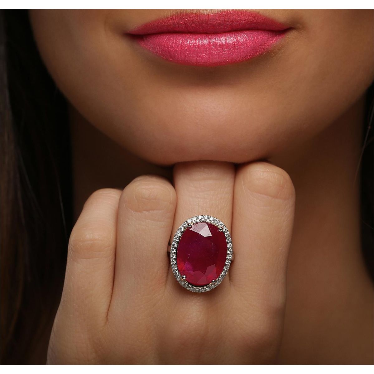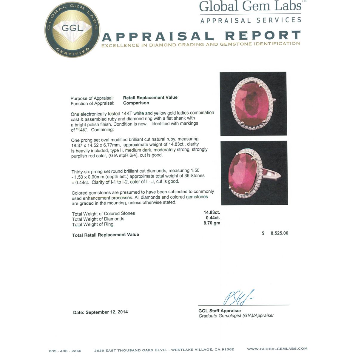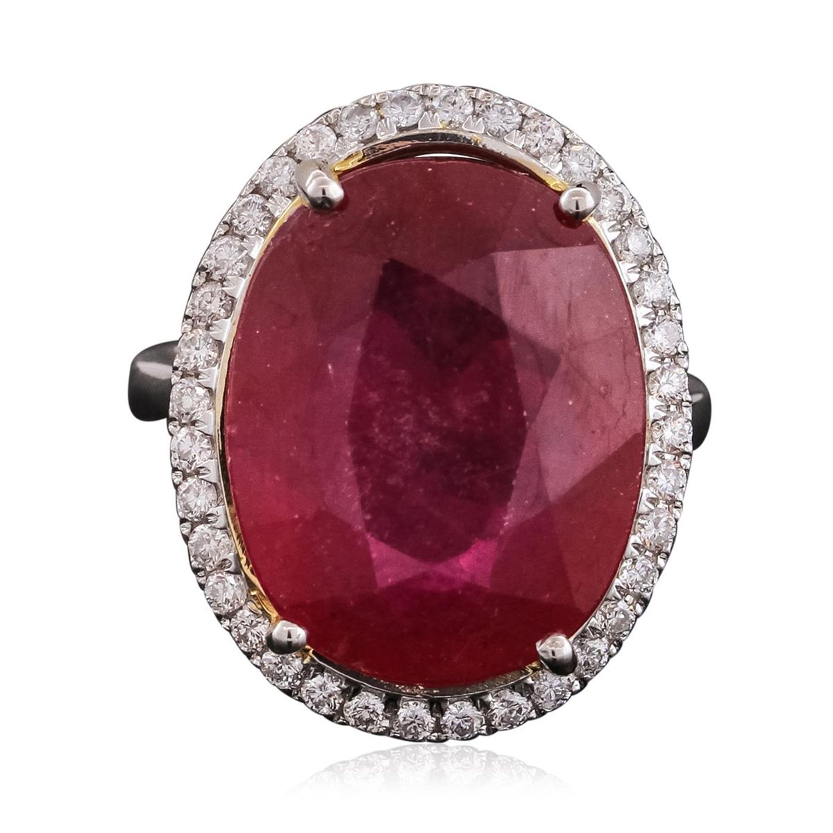 One electronically tested 14KT white and yellow gold ladies combination cast & assembled ruby and diamond ring with a flat shank with a bright polish finish. Identified with markings of "14K". Condition is new. Containing: One prong set oval modified brilliant cut natural ruby, measuring 18.37 x 14.52 x 6.77mm, approximate weight of 14.83ct., clarity is heavily included, type II, medium dark, moderately strong, strongly purplish red color, (GIA stpR 6/4), cut is good. Thirty-Six prong set round brilliant cut diamonds, measuring 1.50 - 1.50 x 0.90mm (depth est.) approximate total weight of 36 Stones = 0.44ct. Clarity: I-1 to I-2. Color: I - J, Cut is Good. Colored gemstones are presumed to have been subjected to commonly used enhancement processes. All diamonds and colored gemstones are graded in the mounting, unless otherwise stated total weight of Colored Stones 14.83ct. Total Weight of Diamonds 0.44ct. Total Weight of Ring 8.70 grams. GGL Appraised at $8,525.00.