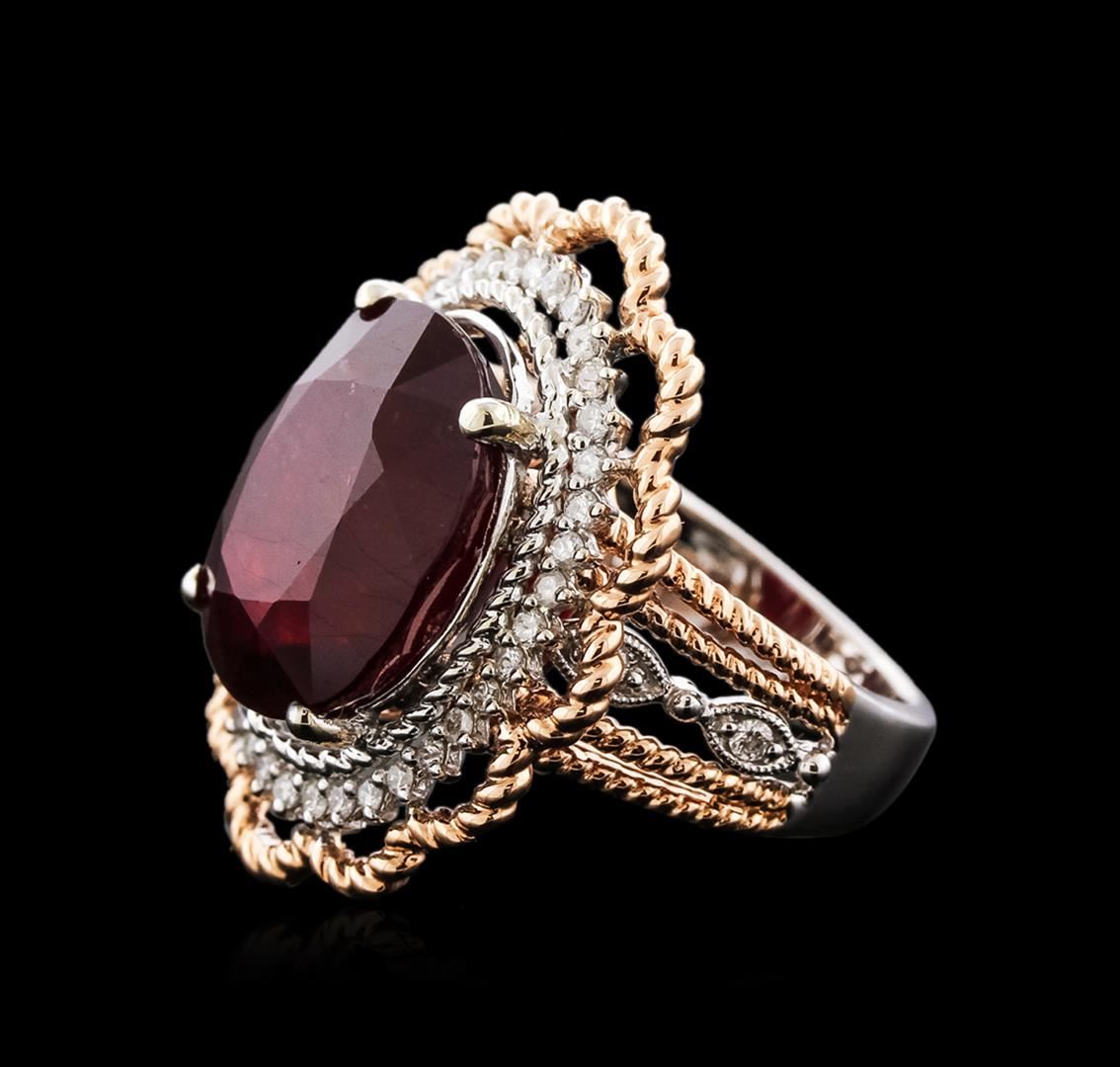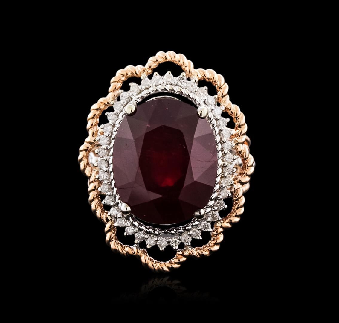 One ring featuring: 14KT white and rose gold weighing 9.10 grams containing one oval ruby weighing 16.90ct and 42 round diamonds weighing a total of 0.50ct.