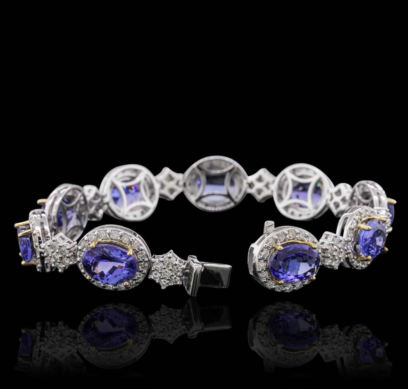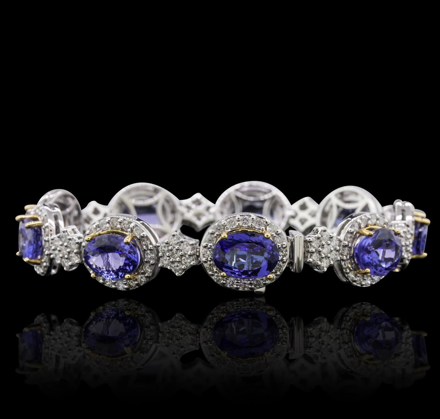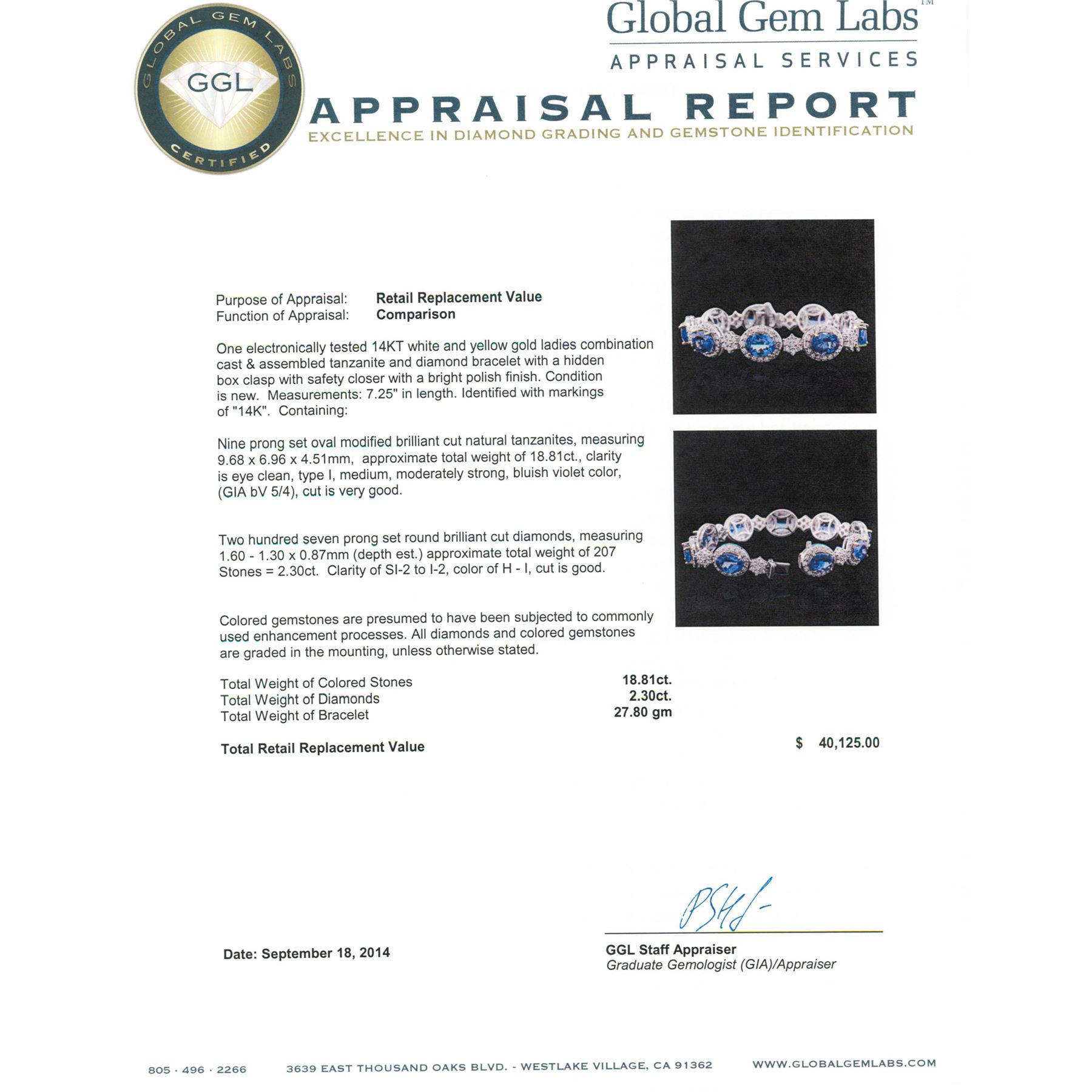 One electronically tested 14KT white and yellow gold ladies combination cast & assembled tanzanite and diamond bracelet with a hidden box clasp with safety closer with a bright polish finish. Measurements: 7.25" in length. Identified with markings of "14K". Condition is new. Containing: Nine prong set oval modified brilliant cut natural tanzanites, measuring 9.68 x 6.96 x 4.51mm, approximate total weight of 18.81ct., clarity is eye clean, type I, medium, moderately strong, bluish violet color, (GIA bV 5/4), cut is very good. Two Hundred Seven prong set round brilliant cut diamonds, measuring 1.60 - 1.30 x 0.87mm (depth est.) approximate total weight of 207 Stones = 2.30ct. Clarity: SI-2 to I-2. Color: H - I, Cut is Good. Colored gemstones are presumed to have been subjected to commonly used enhancement processes. All diamonds and colored gemstones are graded in the mounting, unless otherwise stated. Total Weight of Colored Stones 18.81ct. Total Weight of Diamonds 2.30ct. Total Weight of Bracelet 27.80 grams. GGL Appraised at $40,125.00.