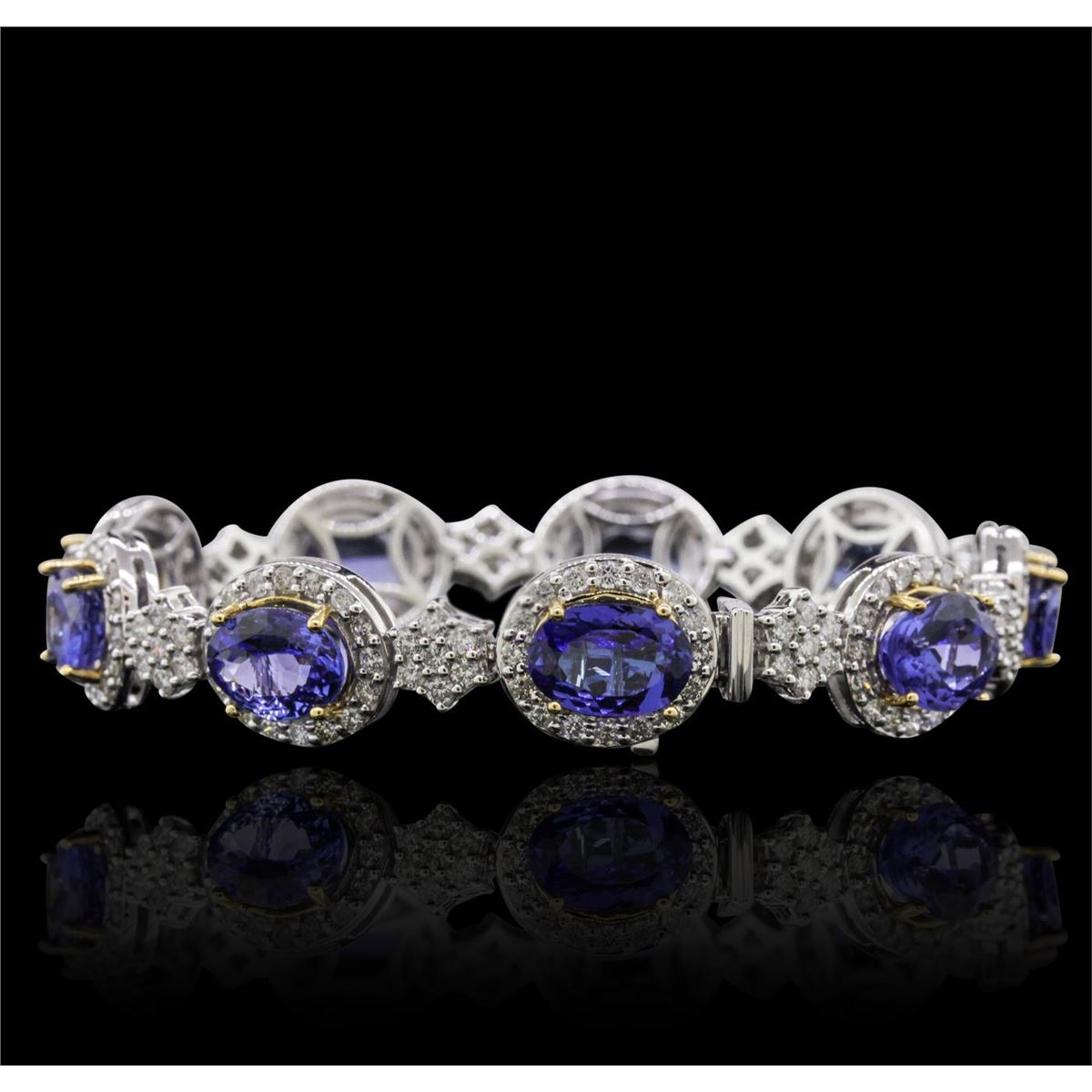 One electronically tested 14KT white and yellow gold ladies combination cast & assembled tanzanite and diamond bracelet with a hidden box clasp with safety closer with a bright polish finish. Measurements: 7.25" in length. Identified with markings of "14K". Condition is new. Containing: Nine prong set oval modified brilliant cut natural tanzanites, measuring 9.68 x 6.96 x 4.51mm, approximate total weight of 18.81ct., clarity is eye clean, type I, medium, moderately strong, bluish violet color, (GIA bV 5/4), cut is very good. Two Hundred Seven prong set round brilliant cut diamonds, measuring 1.60 - 1.30 x 0.87mm (depth est.) approximate total weight of 207 Stones = 2.30ct. Clarity: SI-2 to I-2. Color: H - I, Cut is Good. Colored gemstones are presumed to have been subjected to commonly used enhancement processes. All diamonds and colored gemstones are graded in the mounting, unless otherwise stated. Total Weight of Colored Stones 18.81ct. Total Weight of Diamonds 2.30ct. Total Weight of Bracelet 27.80 grams. GGL Appraised at $40,125.00.