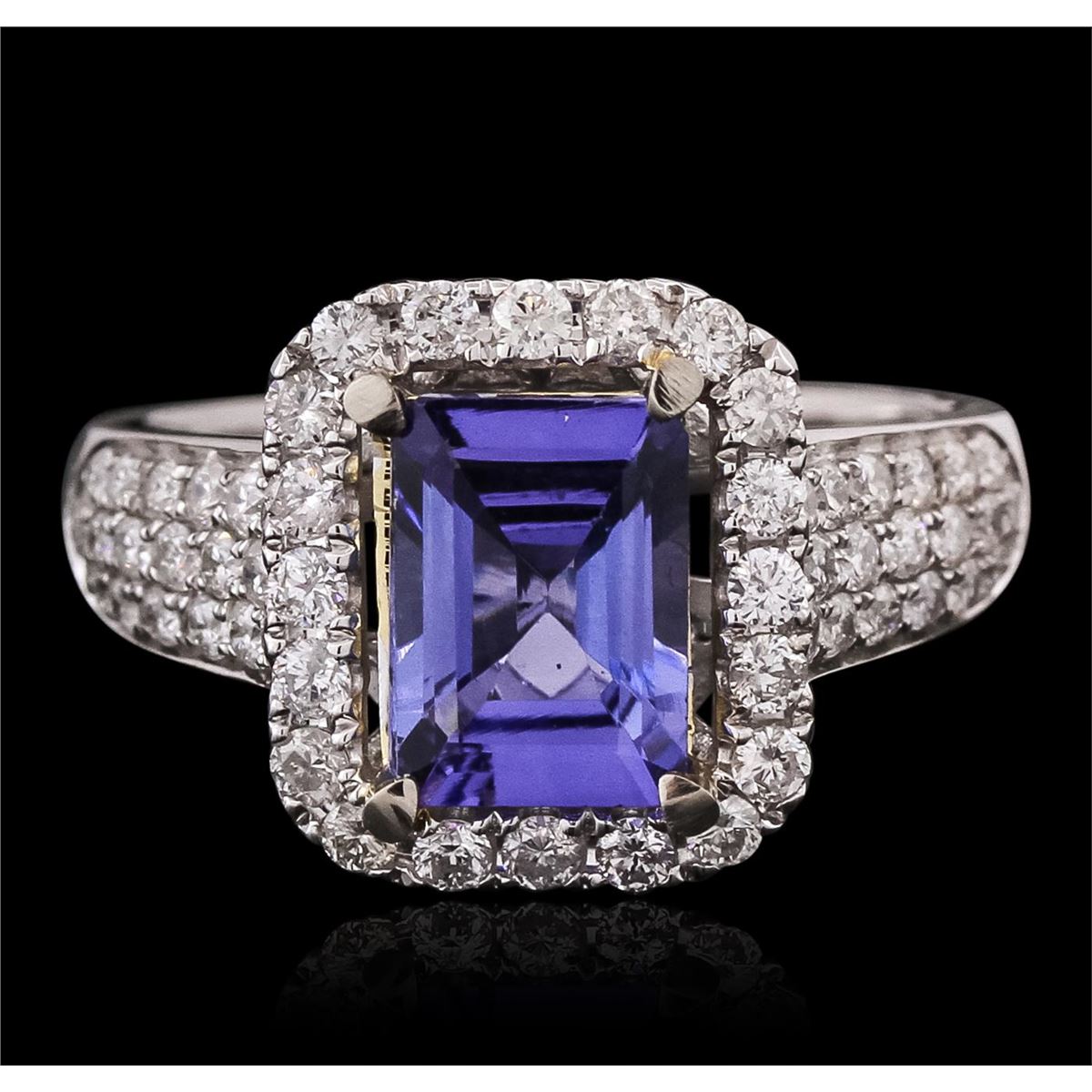 One electronically tested 14KT white and yellow gold ladies combination cast & assembled tanzanite and diamond ring with a flat shank with a bright polish finish. Identified with markings of "14K". Condition is new. Containing: One prong set emerald standard step cut natural tanzanite, measuring 8.85 x 6.45 x 3.87mm, approximate weight of 2.00ct., clarity is eye clean, type I, medium light, very slightly grayish, violet color, (GIA V 4/3), cut is good. Fifty-Six prong set round brilliant cut diamonds, measuring 1.50 - 1.50 x 0.90mm (depth est.) approximate total weight of 56 Stones = 0.69ct. Clarity: SI-2 to I-2. Color: I - J, Cut is Good. Colored gemstones are presumed to have been subjected to commonly used enhancement processes. All diamonds and colored gemstones are graded in the mounting, unless otherwise stated total weight of Colored Stones 2.00ct. Total Weight of Diamonds 0.69ct. Total Weight of Ring 6.00 grams. GGL Appraised at $6,825.00.