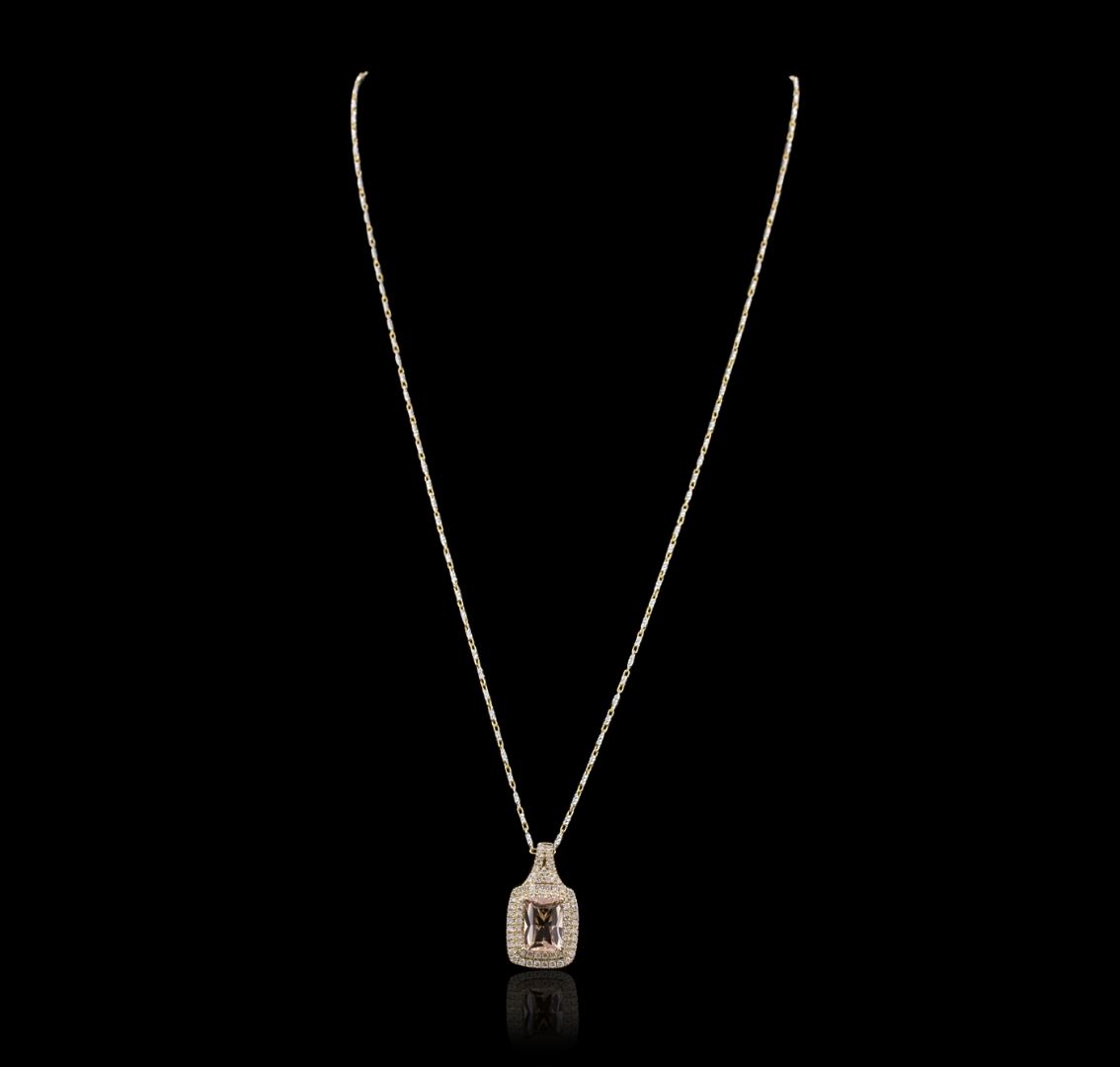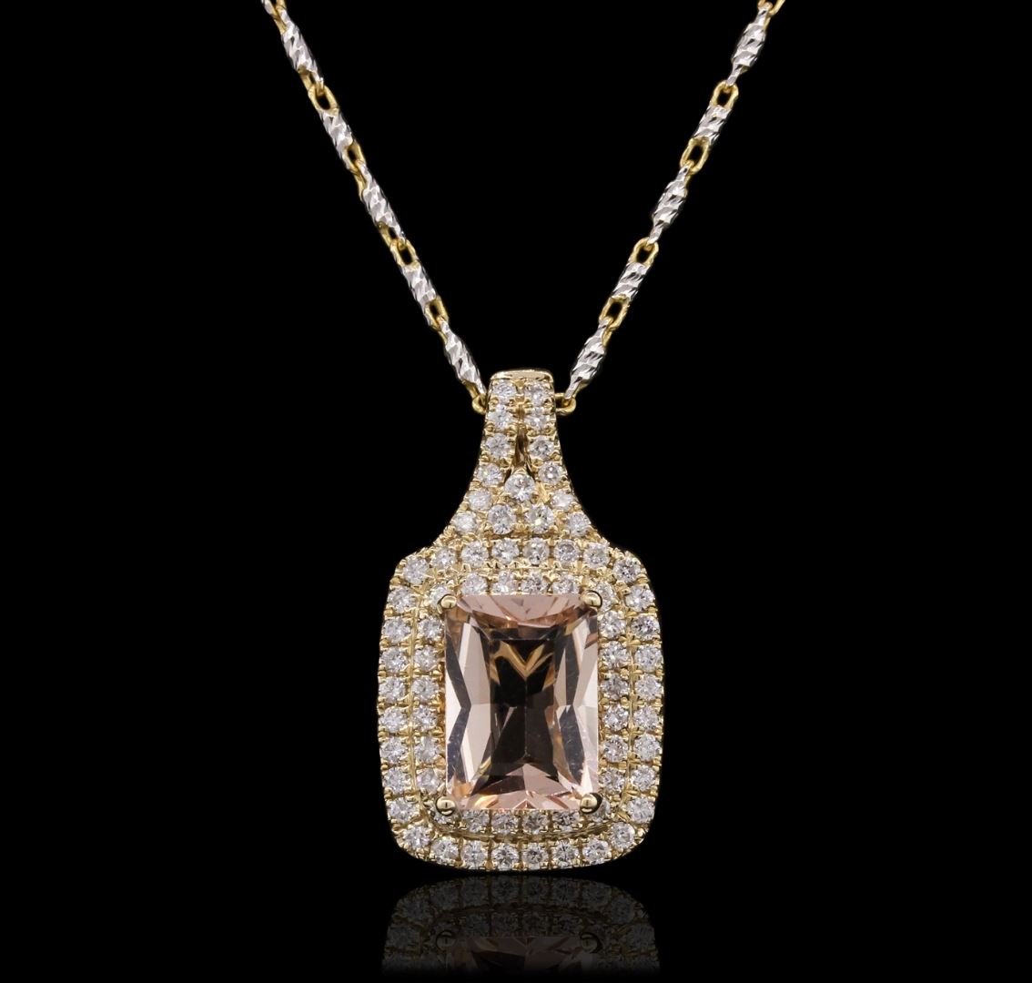 One electronically tested 14KT white and yellow gold Ladies combination cast & assembled pendant & chain 17.5" long, light open cable link with a lobster claw clasp with a bright polish finish. Identified with markings of "14K". Condition is new. Containing: One prong set rectangular cushion modified brilliant cut natural morganite, measuring 9.89 x 7.01 x 4.30mm, approximate weight of 2.02ct., clarity is eye clean, type I, light, brownish, reddish orange color, (GIA rO 3/1), cut is very good. Colored gemstones are presumed to have been subjected to commonly used color/clarity enhancement processes. Sixty-Six prong set round brilliant cut diamonds, measuring 1.30 - 1.30 x 0.78mm (depth est.) approximate. Total Weight of 66 Stones = 0.53ct. Clarity: I-1 to I-2. Color: H - I, Cut is Good. Total Weight of Colored Stones 2.02ct. Total Weight of Diamonds 0.53ct. Total Weight of Pendant & Chain 7.80 grams. GGL Appraised at $6,145.00.