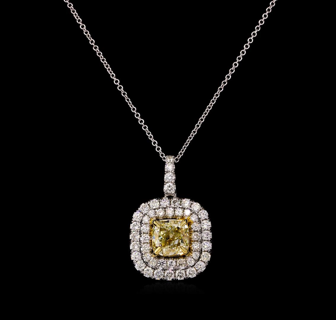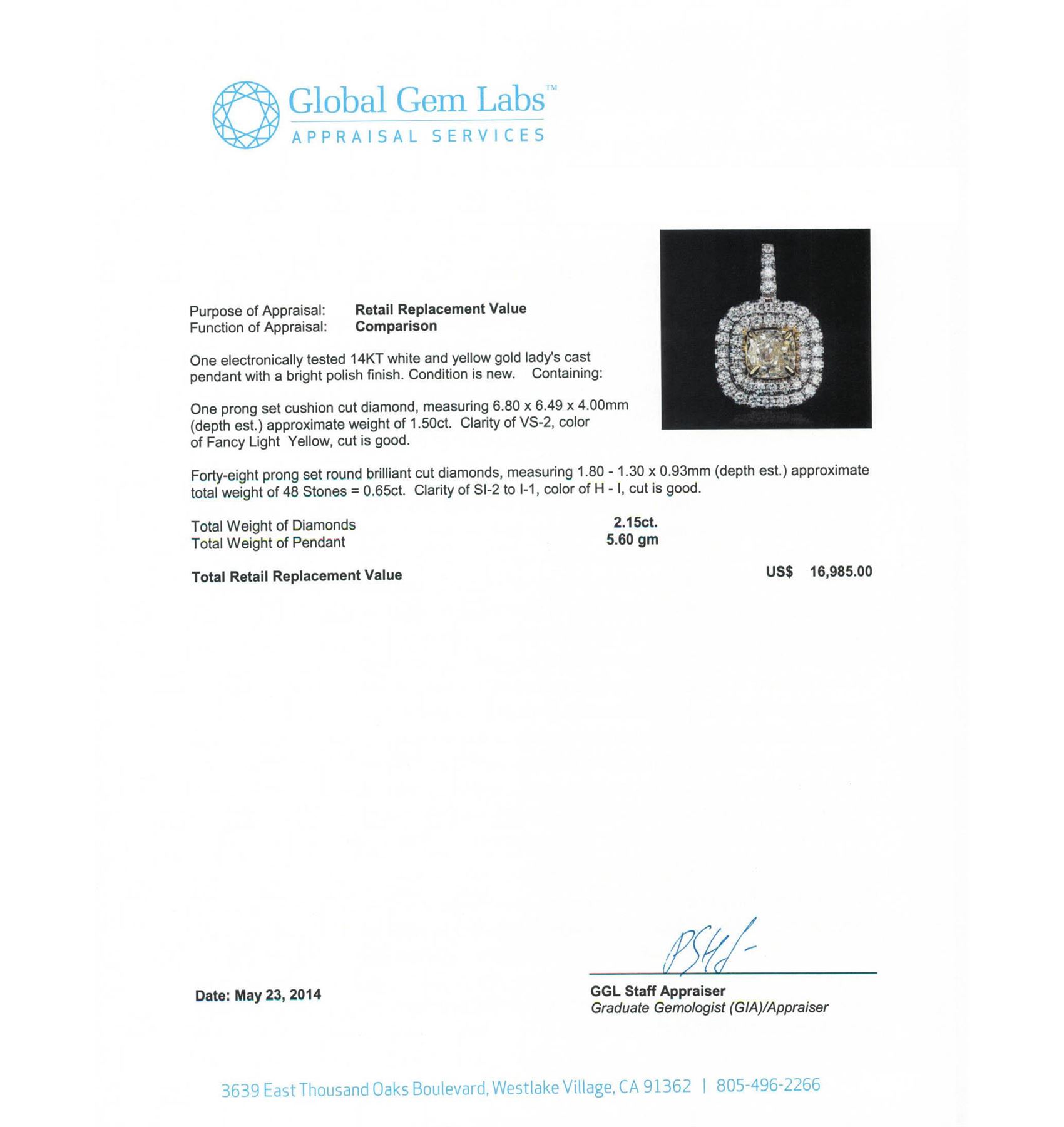 One electronically tested 14KT white and yellow gold Ladies cast pendant with a bright polish finish. Condition is new. Containing: One prong set cushion cut diamond, measuring 6.80 x 6.49 x 4.00mm (depth est.) approximate weight of 1.50ct. Clarity: VS-2, Cut is Good. Forty-Eight prong set round brilliant cut diamonds, measuring 1.80 - 1.30 x 0.93mm (depth est.) approximate. Total Weight of 48 Stones = 0.65ct. Clarity: SI-2 to I-1. Color: H - I, Cut is Good. Total Weight of Diamonds 2.15ct. Total Weight of Pendant 5.60 grams. GGL Appraised at $16,985.00.