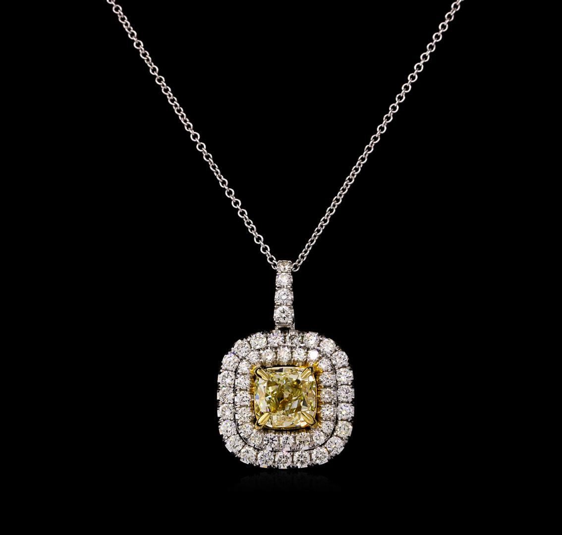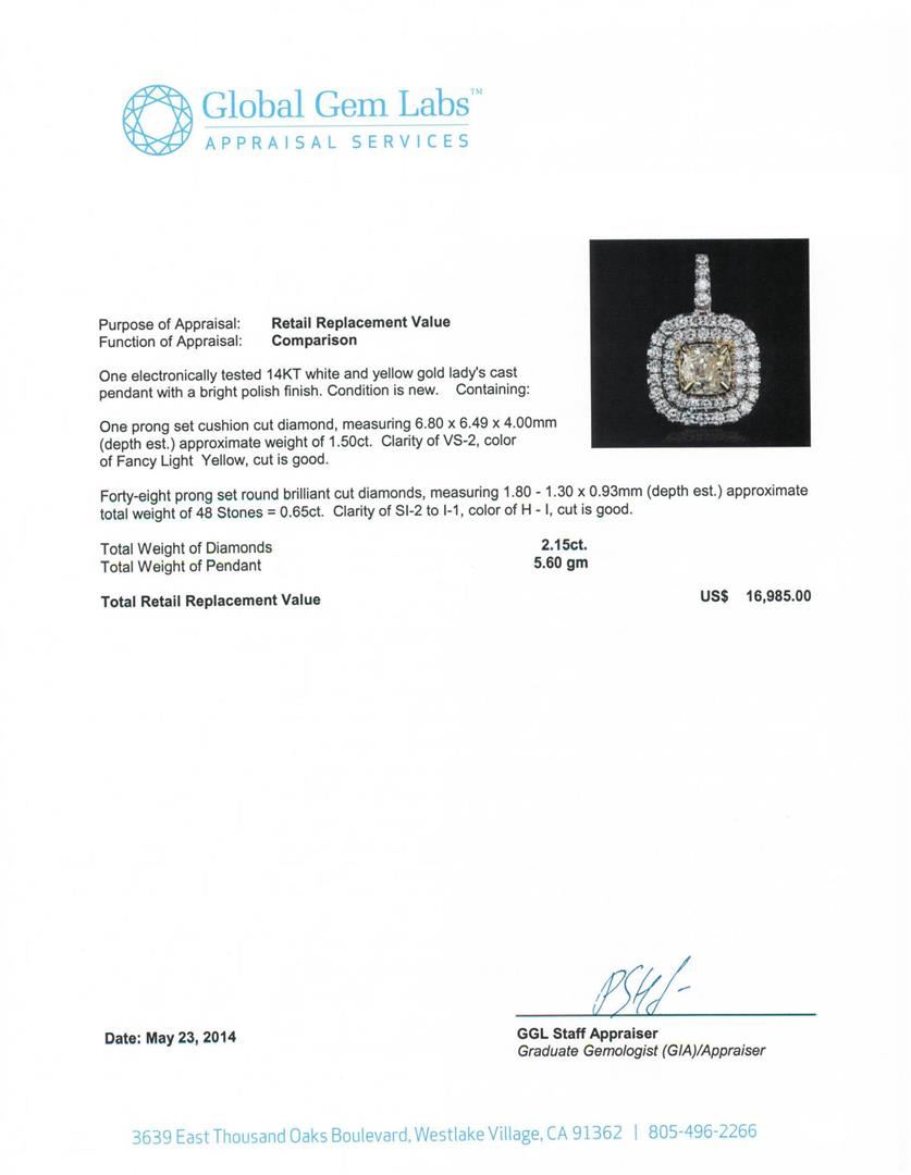 One electronically tested 14KT white and yellow gold Ladies cast pendant with a bright polish finish. Condition is new. Containing: One prong set cushion cut diamond, measuring 6.80 x 6.49 x 4.00mm (depth est.) approximate weight of 1.50 ct. Clarity: VS-2, Cut is Good. Forty-Eight prong set round brilliant cut diamonds, measuring 1.80 - 1.30 x 0.93mm (depth est.) approximate. Total Weight of 48 Stones = 0.65ct. Clarity: SI-2 to I-1. Color: H - I, Cut is Good. Total Weight of Diamonds 2.15ct. Total Weight of Pendant 5.60 grams. GGL Appraised.
