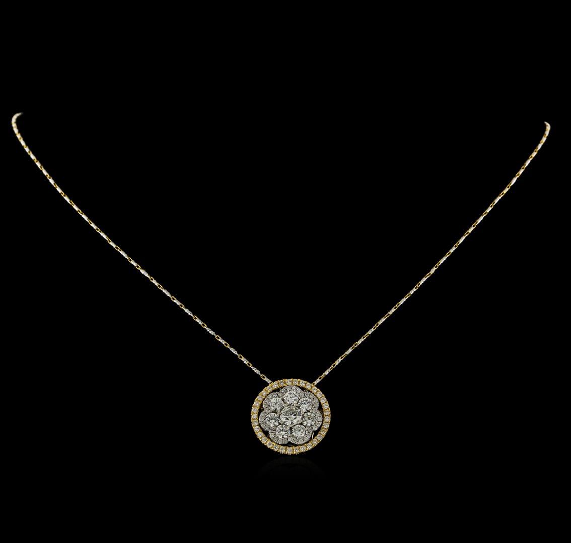 One electronically tested 14KT yellow and white gold ladies combination cast & assembled pendant & chain 17.0" long, medium fancy link with a lobster claw clasp with a bright polish finish. Identified with markings of "14K". Condition is new. Containing: One prong set round brilliant cut diamond, measuring 5.30 - 5.30 x 3.18mm (depth est.) approximate weight of 0.55ct. Clarity: I-2. Color: J, Cut is Good. Seven prong set round brilliant cut diamonds, measuring 3.50 - 3.50 x 2.10mm (depth est.) approximate total weight of 7 Stones = 1.10ct. Clarity: SI-1 to SI-2. Color: I - J, Cut is Good. Seventy-Seven prong set round brilliant cut diamonds, measuring 1.30 - 1.20 x 0.75mm (depth est.) approximate total weight of 77 Stones = 0.55ct. Clarity: SI-2 to I-1. Color: I - J, Cut is Good. All diamonds are graded in the mounting, unless otherwise stated. Total Weight of Diamonds 2.19ct. Total Weight of Pendant & Chain 9.60 grams. GGL Appraised at $12,230.00.