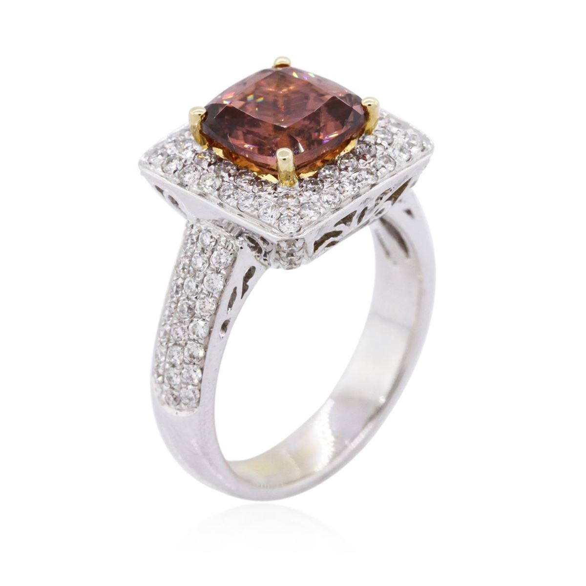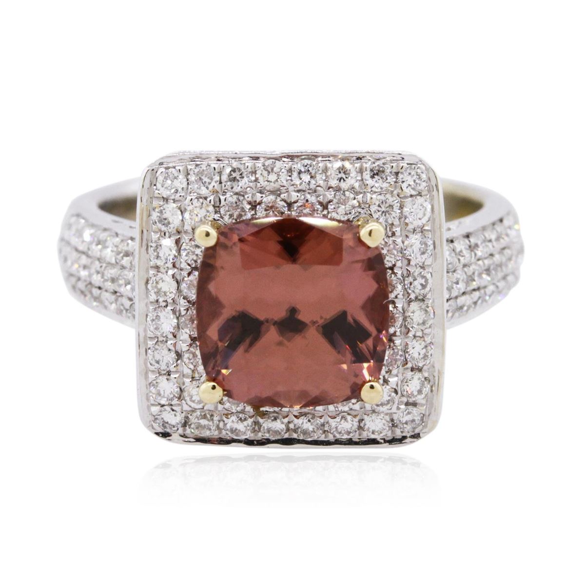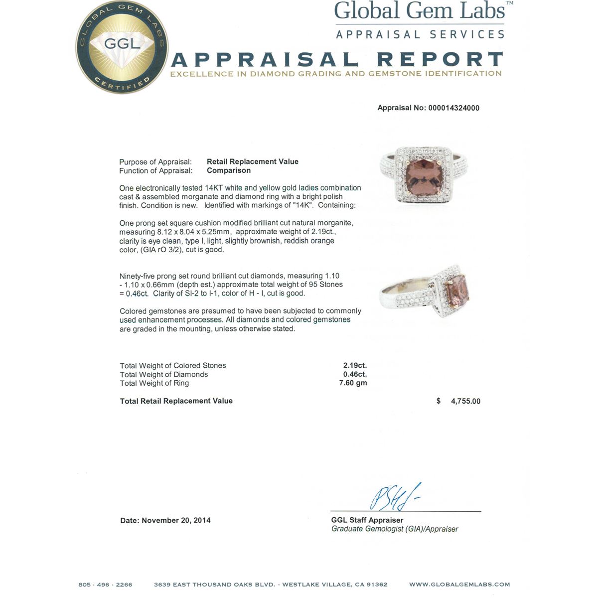 One electronically tested 14KT white and yellow gold ladies combination cast & assembled morganite and diamond ring with a bright polish finish. Identified with markings of "14K". Condition is new. Containing: One prong set square cushion modified brilliant cut natural morganite, measuring 8.12 x 8.04 x 5.25mm, approximate weight of 2.19ct., clarity is eye clean, type I, light, slightly brownish, reddish orange color, (GIA rO 3/2), cut is good. Ninety-Five prong set round brilliant cut diamonds, measuring 1.10 - 1.10 x 0.66mm (depth est.) approximate total weight of 95 Stones = 0.46ct. Clarity: SI-2 to I-1. Color: H - I, Cut is Good. Colored gemstones are presumed to have been subjected to commonly used enhancement processes. All diamonds and colored gemstones are graded in the mounting, unless otherwise stated. Total Weight of Colored Stones 2.19ct. Total Weight of Diamonds 0.46ct. Total Weight of Ring 7.60 grams. GGL Appraised at $4,755.00.
