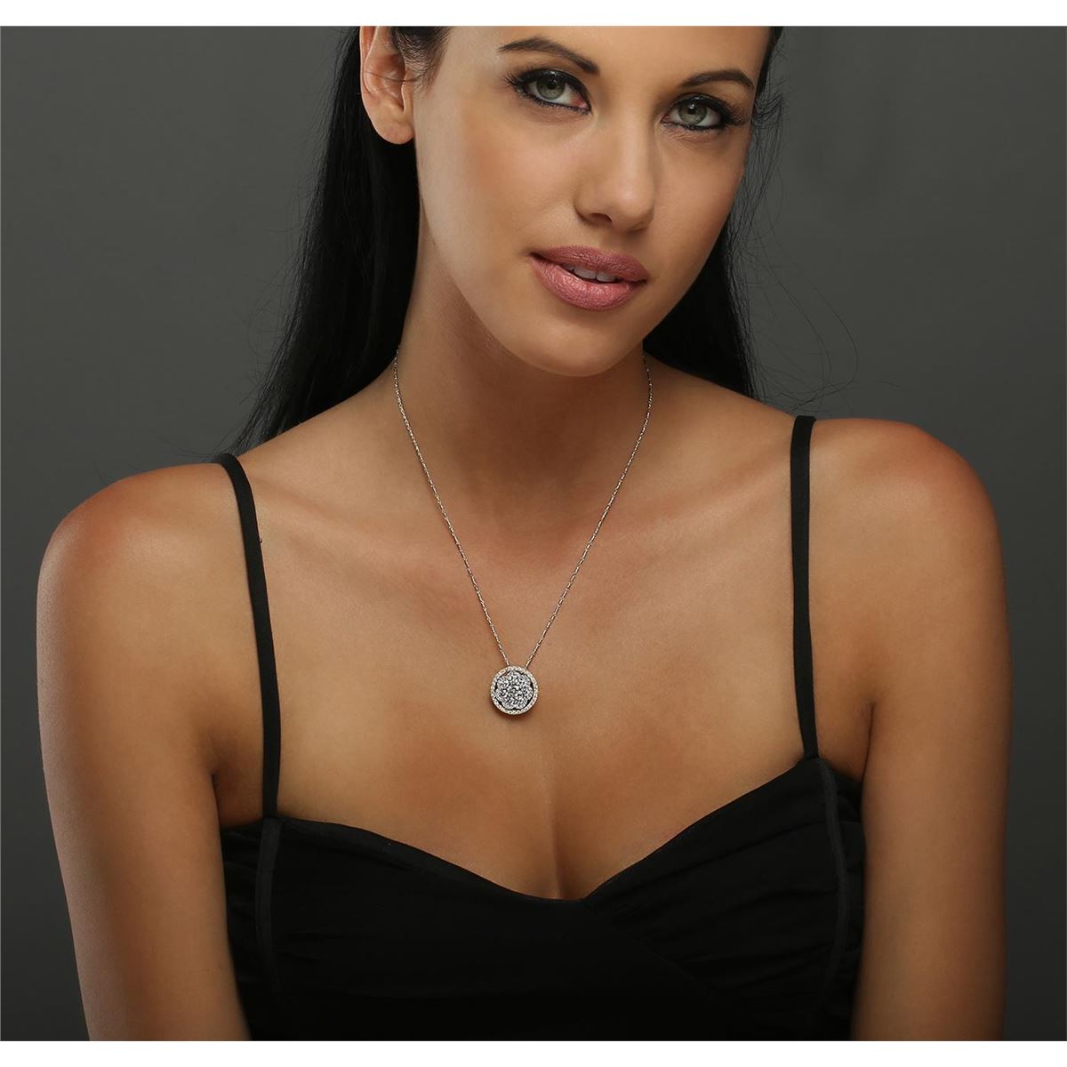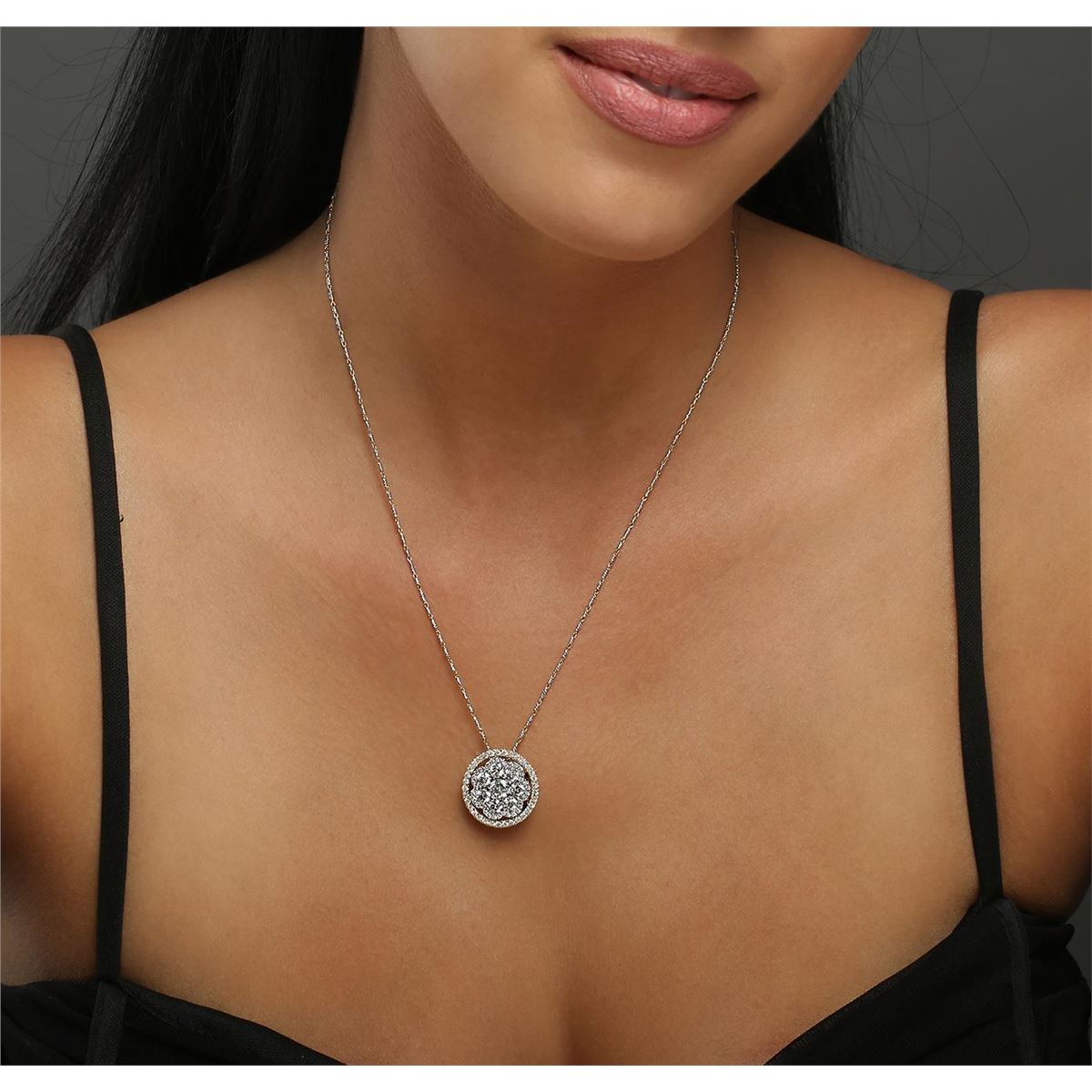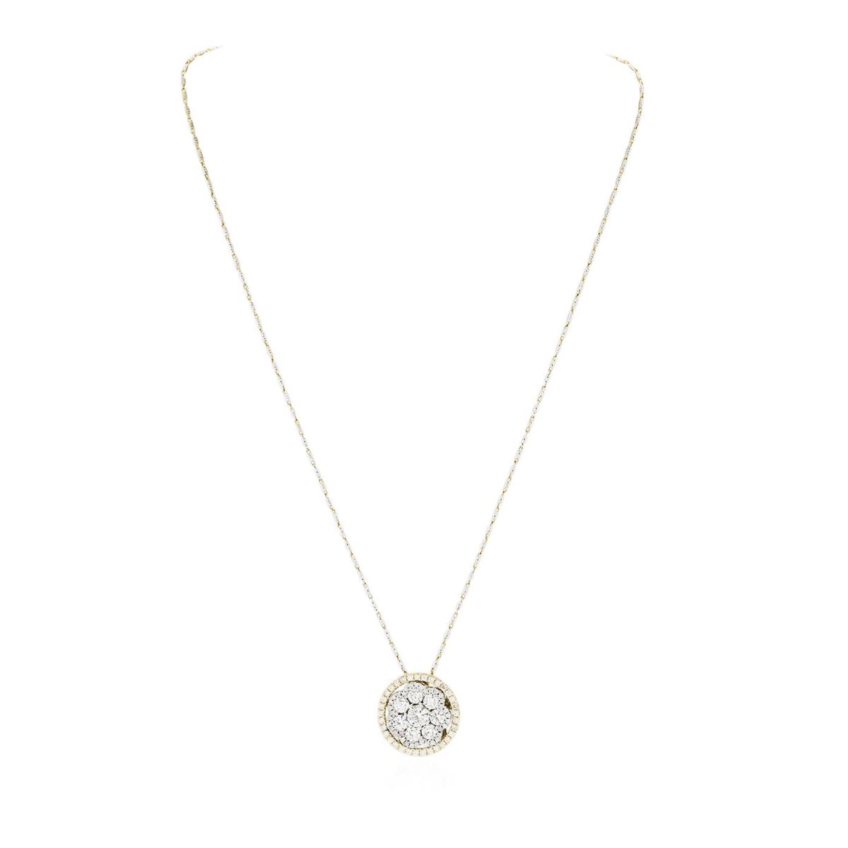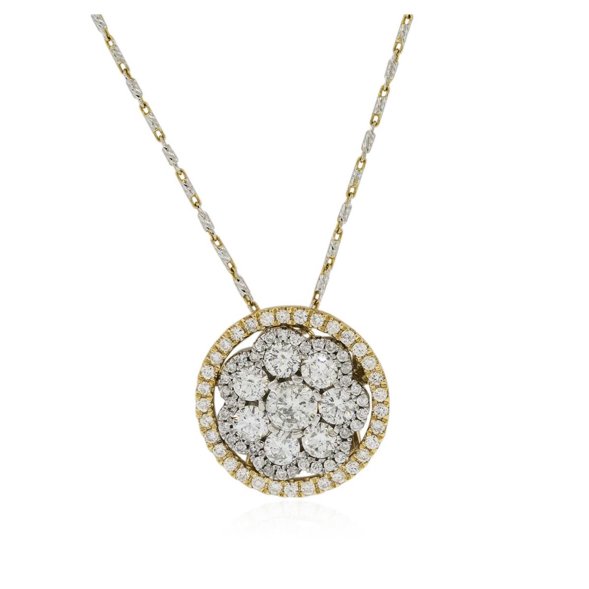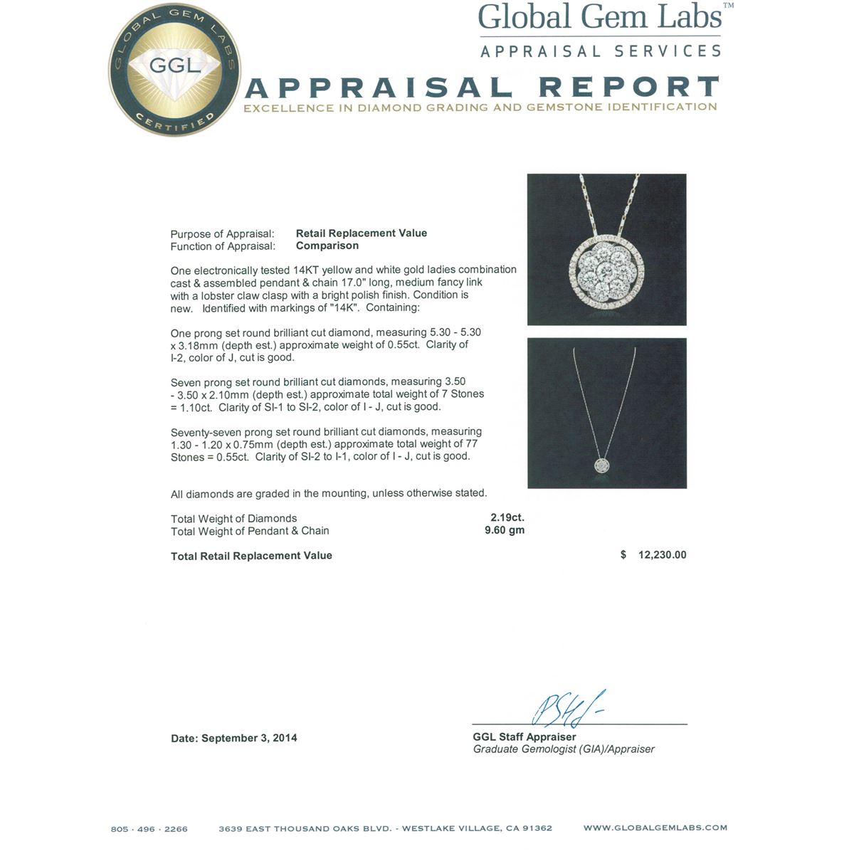 One electronically tested 14KT yellow and white gold ladies combination cast & assembled pendant & chain 17.0" long, medium fancy link with a lobster claw clasp with a bright polish finish. Identified with markings of "14K". Condition is new. Containing: One prong set round brilliant cut diamond, measuring 5.30 - 5.30 x 3.18mm (depth est.) approximate weight of 0.55ct. Clarity: I-2. Color: J, Cut is Good. Seven prong set round brilliant cut diamonds, measuring 3.50 - 3.50 x 2.10mm (depth est.) approximate total weight of 7 Stones = 1.10ct. Clarity: SI-1 to SI-2. Color: I - J, Cut is Good. Seventy-Seven prong set round brilliant cut diamonds, measuring 1.30 - 1.20 x 0.75mm (depth est.) approximate total weight of 77 Stones = 0.55ct. Clarity: SI-2 to I-1. Color: I - J, Cut is Good. All diamonds are graded in the mounting, unless otherwise stated. Total Weight of Diamonds 2.19ct. Total Weight of Pendant & Chain 9.60 grams. GGL Appraised at $12,230.00.