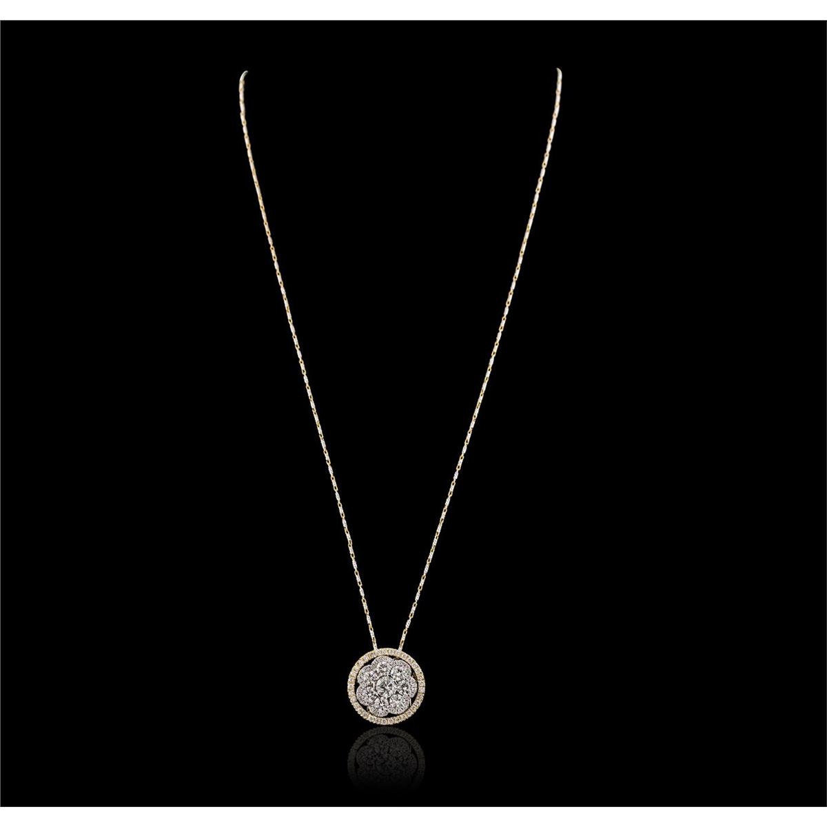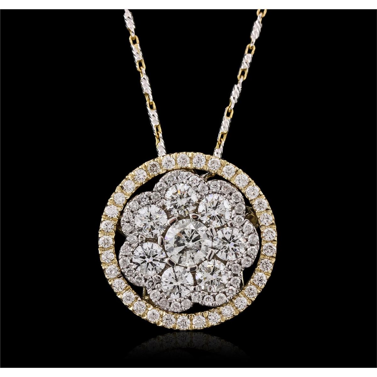 One electronically tested 14KT yellow and white gold ladies combination cast & assembled pendant & chain 17.0" long, medium fancy link with a lobster claw clasp with a bright polish finish. Identified with markings of "14K". Condition is new. Containing: One prong set round brilliant cut diamond, measuring 5.30 - 5.30 x 3.18mm (depth est.) approximate weight of 0.55ct. Clarity: I-2. Color: J, Cut is Good. Seven prong set round brilliant cut diamonds, measuring 3.50 - 3.50 x 2.10mm (depth est.) approximate total weight of 7 Stones = 1.10ct. Clarity: SI-1 to SI-2. Color: I - J, Cut is Good. Seventy-Seven prong set round brilliant cut diamonds, measuring 1.30 - 1.20 x 0.75mm (depth est.) approximate total weight of 77 Stones = 0.55ct. Clarity: SI-2 to I-1. Color: I - J, Cut is Good. All diamonds are graded in the mounting, unless otherwise stated. Total Weight of Diamonds 2.19ct. Total Weight of Pendant & Chain 9.60 grams. GGL Appraised at $12,230.00.