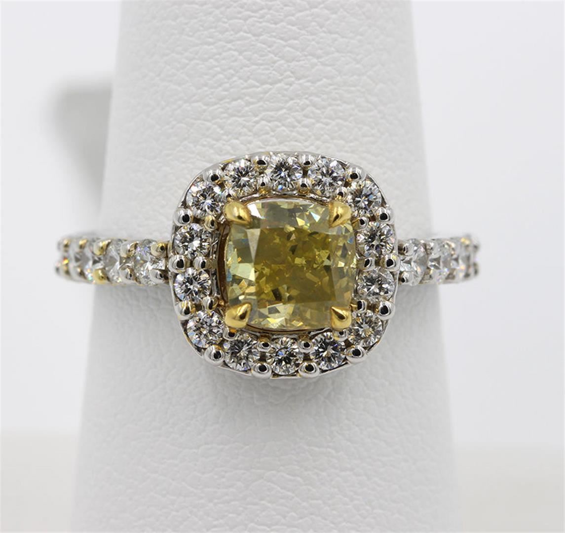 One Natural Halo Fancy Yellow Cushion & Round Diamond Engagement Ring in 14k White & Yellow old. Total carat weight is 2.24. Gross weight is 5.18 grams with a total of 17 stones. Size 7 however can be resized free of charge. Condition is brand new. Main stone is non-enhanced and natural. Main diamond is 1.63 carats, shape cushion cut, clarity SI-1. Color natural fancy yellow (even distribution), and cut is very good. Side stone is non-enhanced and natural and is 0.61 carats. Side diamond shape is brilliant round cut, clarity VS-1 / SI-1, color G, diamond cut very good with a total of 16 side diamonds.