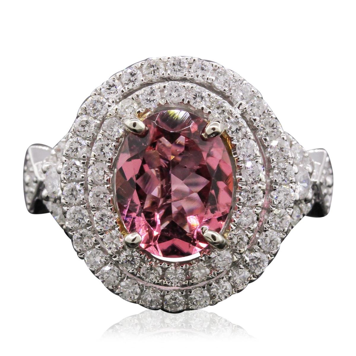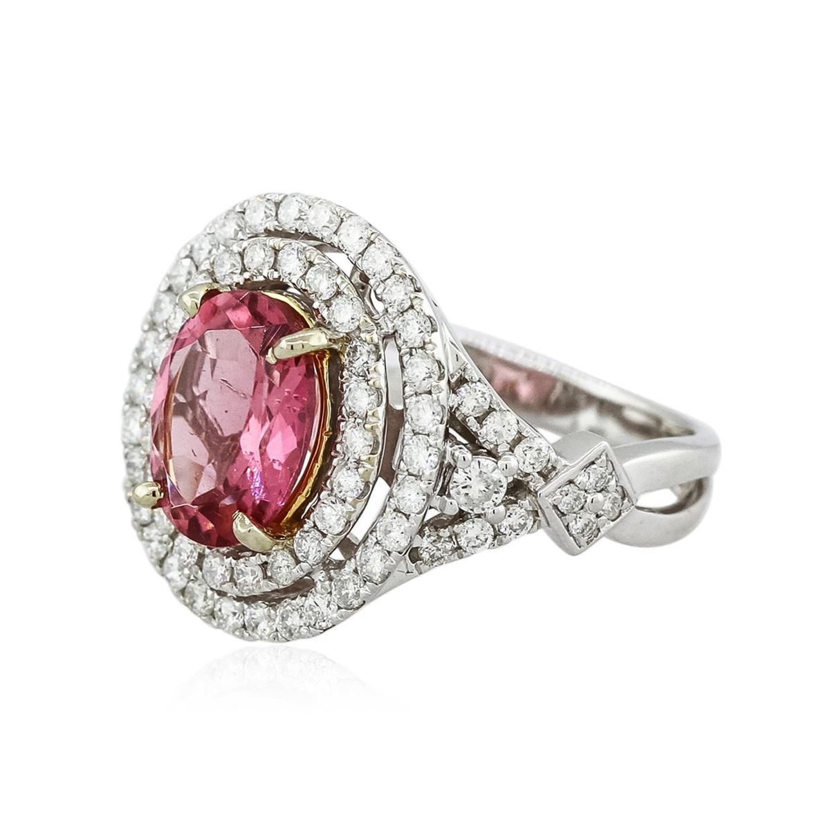 One electronically tested 14KT white and yellow gold Ladies combination cast & assembled ring with a high polish finish. Condition is new. Identified with markings of "14K". Containing: One prong set oval modified mixed cut natural pink tourmaline, measuring 10.00 x 8.00 x 4.00mm, approximate weight of 2.32ct., clarity is slightly included, type II, medium, moderately strong, reddish purple color, (GIA rP 5/4), cut is very good. Colored gemstones are presumed to have been subjected to commonly used color/clarity enhancement processes. Eight bead set round brilliant cut diamonds, measuring 1.00 - 1.00 x 0.60mm (depth est.) approximate. Total Weight of 8 Stones = 0.03ct. Clarity: SI-2 to I-1. Color: G - H, Cut is Good. Sixty-Eight prong set round brilliant cut diamonds, measuring 2.00 - 1.40 x 1.02mm (depth est.) approximate. Total Weight of 68 Stones = 1.11ct. Clarity: SI-2 to I-1. Color: G - H, Cut is Good. Total Weight of Colored Stones 2.32ct. Total Weight of Diamonds 1.14ct. Total Weight of Ring 6.00 grams. GGL Appraised at $7,760.00.