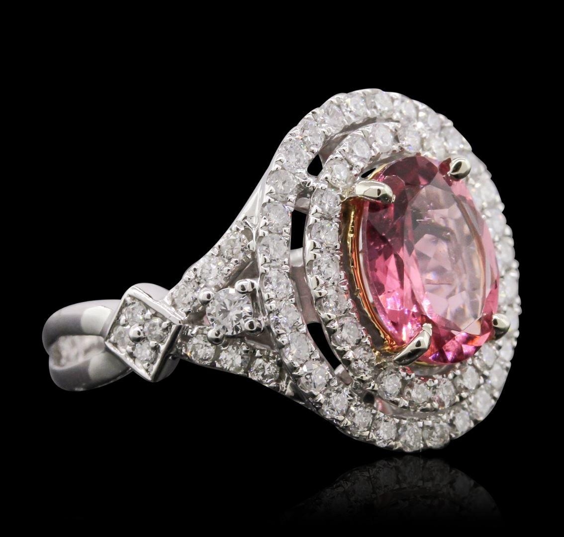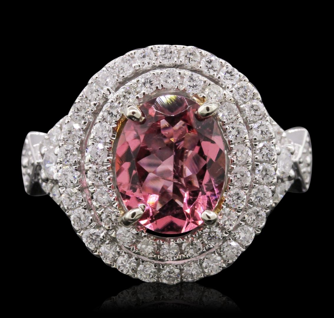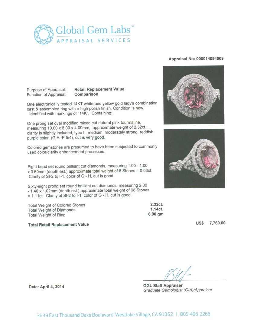 One electronically tested 14KT white and yellow gold Ladies combination cast & assembled ring with a high polish finish. Condition is new. Identified with markings of "14K". Containing: One prong set oval modified mixed cut natural pink tourmaline, measuring 10.00 x 8.00 x 4.00mm, approximate weight of 2.32ct., clarity is slightly included, type II, medium, moderately strong, reddish purple color, (GIA rP 5/4), cut is very good. Colored gemstones are presumed to have been subjected to commonly used color/clarity enhancement processes. Eight bead set round brilliant cut diamonds, measuring 1.00 - 1.00 x 0.60mm (depth est.) approximate. Total Weight of 8 Stones = 0.03ct. Clarity: SI-2 to I-1. Color: G - H, Cut is Good. Sixty-Eight prong set round brilliant cut diamonds, measuring 2.00 - 1.40 x 1.02mm (depth est.) approximate. Total Weight of 68 Stones = 1.11ct. Clarity: SI-2 to I-1. Color: G - H, Cut is Good. Total Weight of Colored Stones 2.32ct. Total Weight of Diamonds 1.14ct. Total Weight of Ring 6.00 grams. GGL Appraised at $7,760.00.