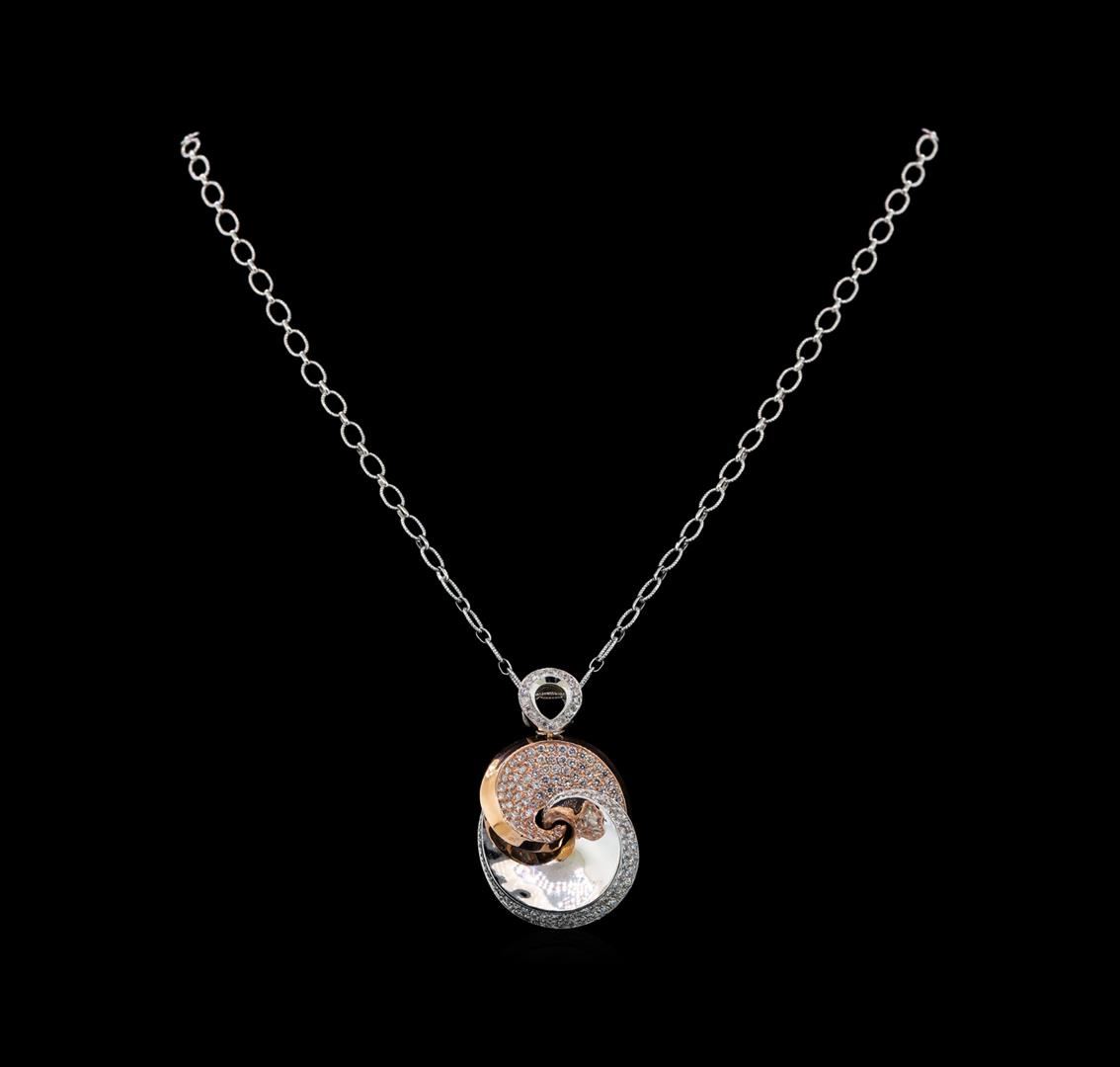 One electronically tested 14KT white and rose gold ladies cast diamond pendant & chain 16.0" long, with a lobster claw clasp with a bright polish finish. Identified with markings of "14K". Condition is new. Containing: One Hundred Seventy-Two prong set round brilliant cut diamonds, measuring 1.50 - 1.50 x 0.90mm (depth est.) approximate total weight of 172 Stones = 2.38ct. Clarity: VS-2 to SI-1. Color: G - H, Cut is Good. All diamonds are graded in the mounting, unless otherwise stated. Total Weight of Diamonds 2.38ct. Total Weight of Pendant & Chain 14.30 grams. GGL Appraised at $7,385.00.