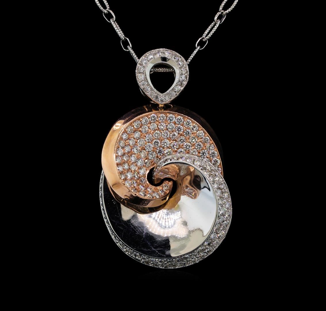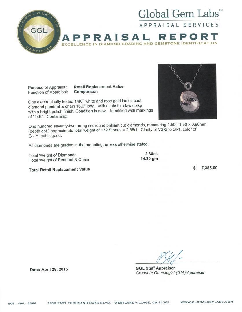 One electronically tested 14KT white and rose gold ladies cast diamond pendant & chain 16.0" long, with a lobster claw clasp with a bright polish finish. Identified with markings of "14K". Condition is new. Containing: One Hundred Seventy-Two prong set round brilliant cut diamonds, measuring 1.50 - 1.50 x 0.90mm (depth est.) approximate total weight of 172 Stones = 2.38ct. Clarity: VS-2 to SI-1. Color: G - H, Cut is Good. All diamonds are graded in the mounting, unless otherwise stated. Total Weight of Diamonds 2.38ct. Total Weight of Pendant & Chain 14.30 grams. GGL Appraised at $7,385.00.