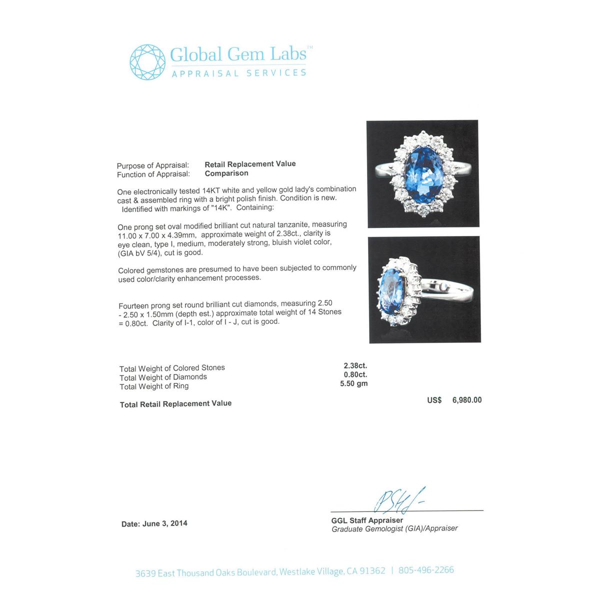 One electronically tested 14KT white and yellow gold Ladies combination cast & assembled ring with a bright polish finish. Condition is new. Identified with markings of "14K". Containing: One prong set oval modified brilliant cut natural tanzanite, measuring 11.00 x 7.00 x 4.39mm, approximate weight of 2.38ct., clarity is eye clean, type I, medium, moderately strong, bluish violet color, (GIA bV 5/4), cut is good. Colored gemstones are presumed to have been subjected to commonly used color/clarity enhancement processes. Fourteen prong set round brilliant cut diamonds, measuring 2.50 - 2.50 x 1.50mm (depth est.) approximate. Total Weight of 14 Stones = 0.80ct. Clarity: I-1. Color: I - J, Cut is Good. Total Weight of Colored Stones 2.38ct. Total Weight of Diamonds 0.80ct. Total Weight of Ring 5.50 grams. GGL Appraised at $6,980.00.