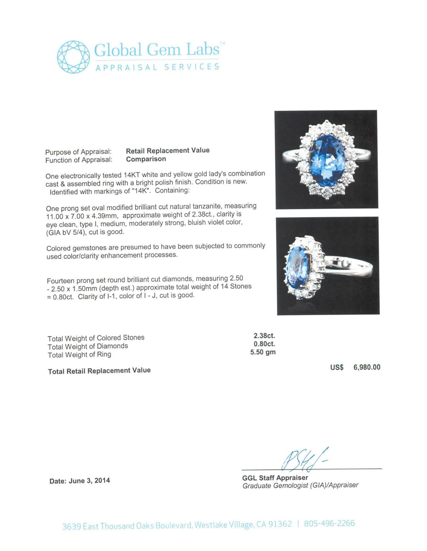 One electronically tested 14KT white and yellow gold Ladies combination cast & assembled ring with a bright polish finish. Condition is new. Identified with markings of "14K". Containing: One prong set oval modified brilliant cut natural tanzanite, measuring 11.00 x 7.00 x 4.39mm, approximate weight of 2.38ct., clarity is eye clean, type I, medium, moderately strong, bluish violet color, (GIA bV 5/4), cut is good. Colored gemstones are presumed to have been subjected to commonly used color/clarity enhancement processes. Fourteen prong set round brilliant cut diamonds, measuring 2.50 - 2.50 x 1.50mm (depth est.) approximate. Total Weight of 14 Stones = 0.80 ct. Clarity: I-1. Color: I - J, Cut is Good. Total Weight of Colored Stones 2.38ct. Total Weight of Diamonds 0.80 ct. Total Weight of Ring 5.50 grams. GGL Appraised.