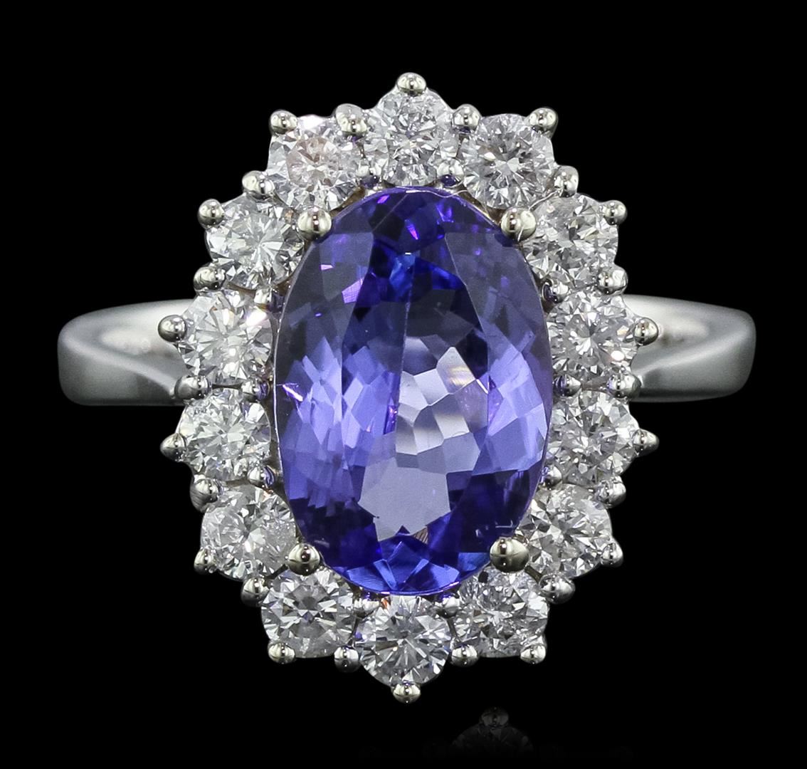 One electronically tested 14KT white and yellow gold Ladies combination cast & assembled ring with a bright polish finish. Condition is new. Identified with markings of "14K". Containing: One prong set oval modified brilliant cut natural tanzanite, measuring 11.00 x 7.00 x 4.39mm, approximate weight of 2.38ct., clarity is eye clean, type I, medium, moderately strong, bluish violet color, (GIA bV 5/4), cut is good. Colored gemstones are presumed to have been subjected to commonly used color/clarity enhancement processes. Fourteen prong set round brilliant cut diamonds, measuring 2.50 - 2.50 x 1.50mm (depth est.) approximate. Total Weight of 14 Stones = 0.80ct. Clarity: I-1. Color: I - J, Cut is Good. Total Weight of Colored Stones 2.38ct. Total Weight of Diamonds 0.80ct. Total Weight of Ring 5.50 grams. GGL Appraised at $6,980.00.