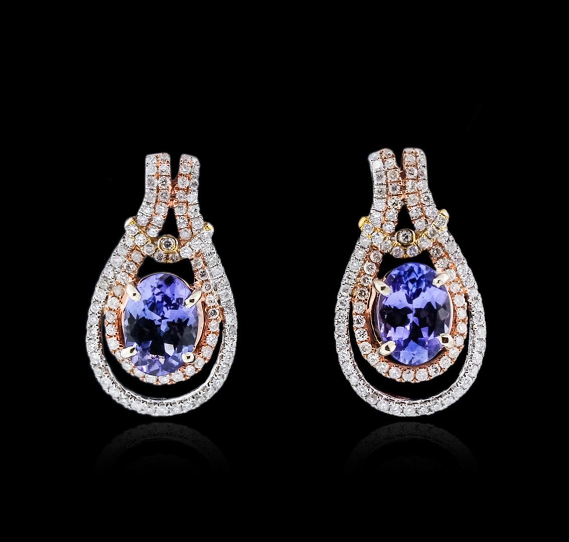 One pair electronically tested 14KT white and rose gold ladies cast tanzanite and diamond earrings with friction posts with a bright polish finish. Identified with markings of "14K". Condition is new. Containing: Two prong set oval modified brilliant cut natural tanzanites, measuring 8.00 x 5.70 x 3.71mm, approximate total weight of 2.38ct., clarity is eye clean, type I, medium light, very slightly grayish, violet color, (GIA V 4/3), cut is good. One Hundred Eighty prong set round brilliant cut diamonds, measuring 1.10 - 1.10 x 0.66mm (depth est.) approximate total weight of 180 Stones = 0.86ct. Clarity: I-1 to I-2. Color: I - J. Colored gemstones are presumed to have been subjected to commonly used enhancement processes. All diamonds and colored gemstones are graded in the mounting, unless otherwise stated. Total Weight of Colored Stones 2.38ct. Total Weight of Diamonds 0.86ct. Total Weight of Earrings 4.60 grams. GGL Appraised at $4,630.00.