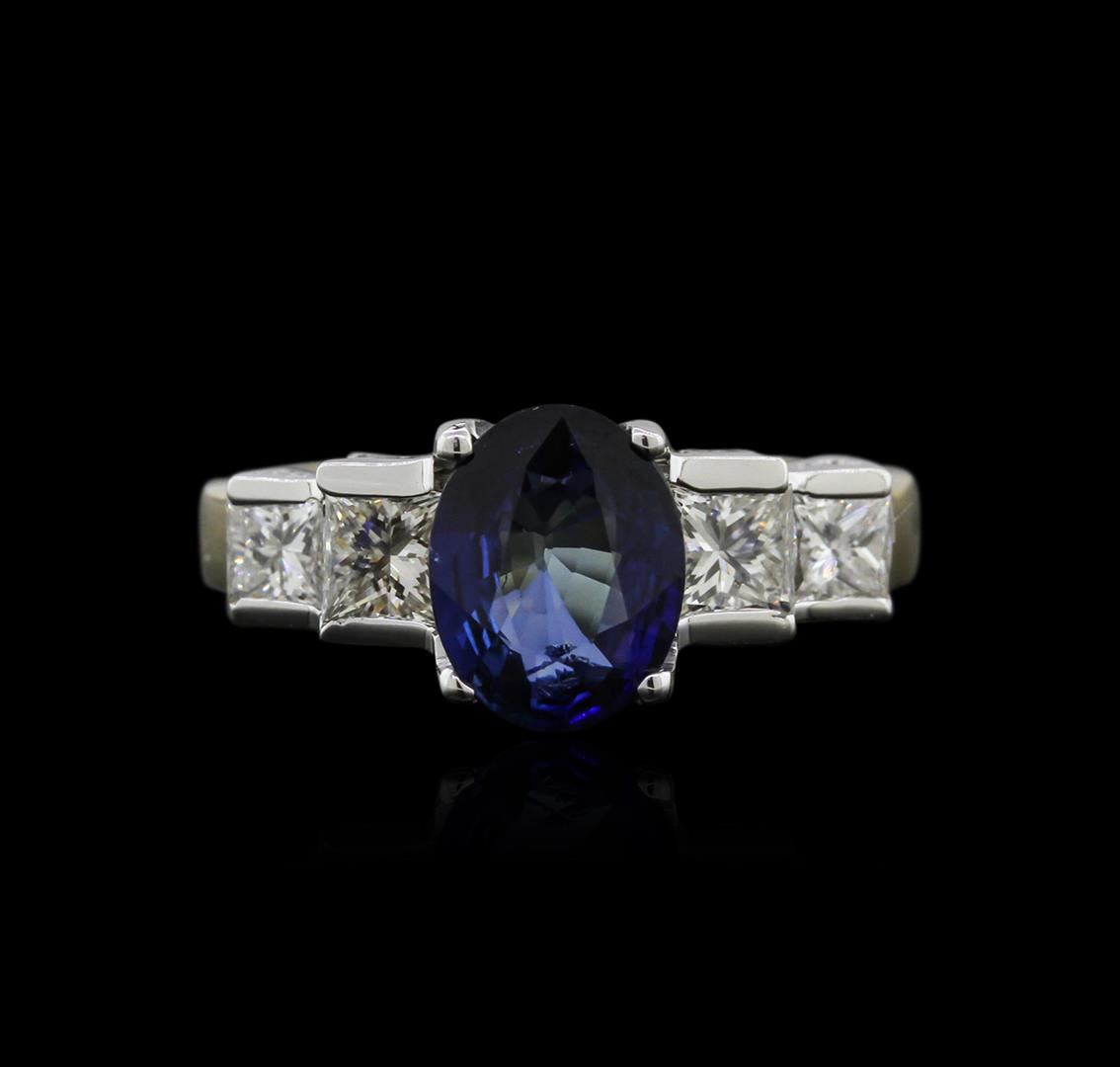 One electronically tested 14KT yellow and white gold ladies cast sapphire and diamond ring with a bright polish finish. Identified with markings of "14K". Condition is very good. Containing: One prong set oval modified brilliant cut natural blue sapphire, measuring 9.20 x 7.00 x 4.55mm, approximate weight of 2.46ct., clarity is eye clean, type II, medium, moderately strong, blue color, (GIA B 5/4), cut is good. Two prong set princess cut diamonds, measuring 3.50 x 3.50 x 2.63mm (depth est.) approximate total weight of 2 Stones = 0.53ct. Clarity: VS-2. Color: J, Cut is Good. Two prong set princess cut diamonds, measuring 3.00 x 3.00 x 2.25mm (depth est.) approximate total weight of 2 Stones = 0.33ct. Clarity: VS-2. Color: H - I, Cut is Good. Colored gemstones are presumed to have been subjected to commonly used enhancement processes. All diamonds and colored gemstones are graded in the mounting, unless otherwise stated. Total Weight of Colored Stones 2.46ct. Total Weight of Diamonds 0.86ct. Total Weight of Ring 6.30 grams. GGL Appraised at $7,315.00.