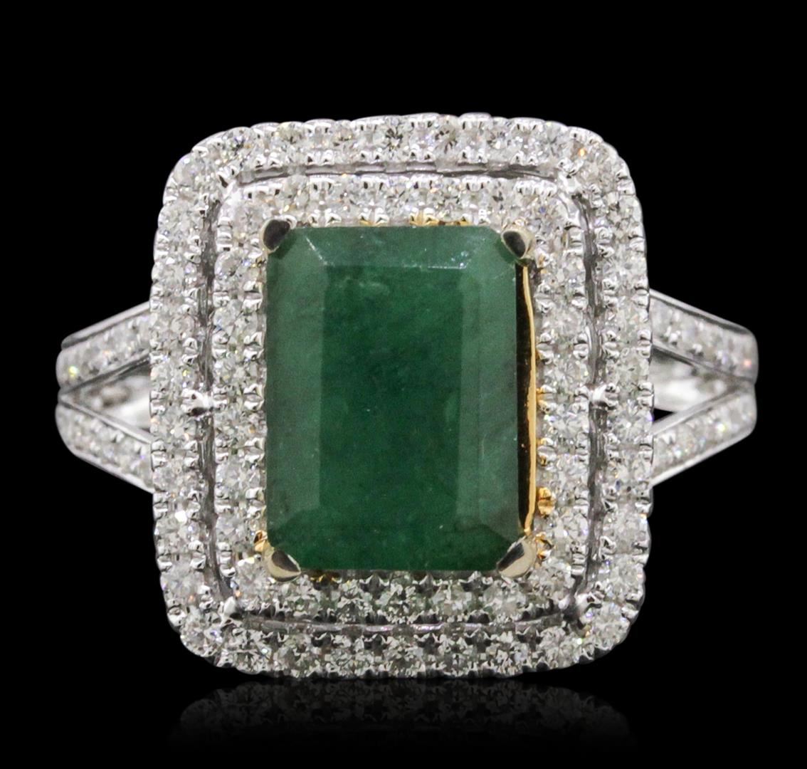 One electronically tested 14KT white and yellow gold ladies combination cast & assembled emerald and diamond ring with a flat shank with a bright polish finish. Identified with markings of "14K". Condition is new. Containing: One prong set emerald standard step cut natural emerald, measuring 9.96 x 7.29 x 4.74mm, approximate weight of 2.53ct., clarity is heavily included, type III, medium dark, moderately strong, green color, (GIA G 6/4), cut is good. One Hundred Two prong set round brilliant cut diamonds, measuring 1.30 - 1.30 x 0.78mm (depth est.) approximate total weight of 102 Stones = 0.82ct. Clarity: SI-2 to I-1. Color: H - I, Cut is Good. Colored gemstones are presumed to have been subjected to commonly used enhancement processes. All diamonds and colored gemstones are graded in the mounting, unless otherwise stated. Total Weight of Colored Stones 2.53ct. Total Weight of Diamonds 0.82ct. Total Weight of Ring 6.80 grams. GGL Appraised at $7,940.00.