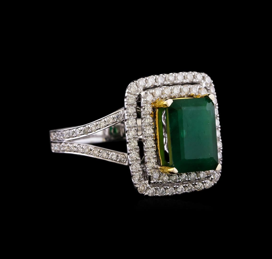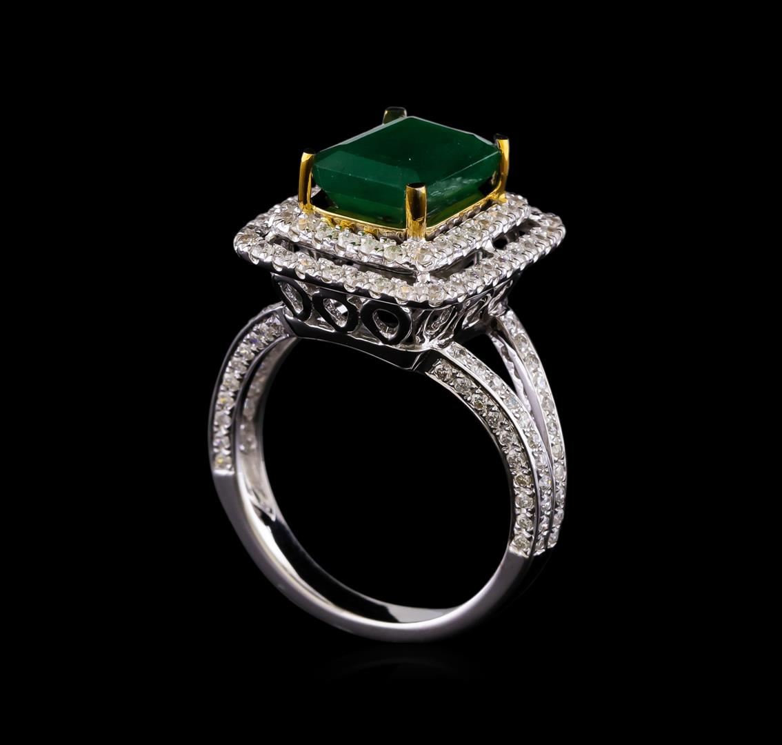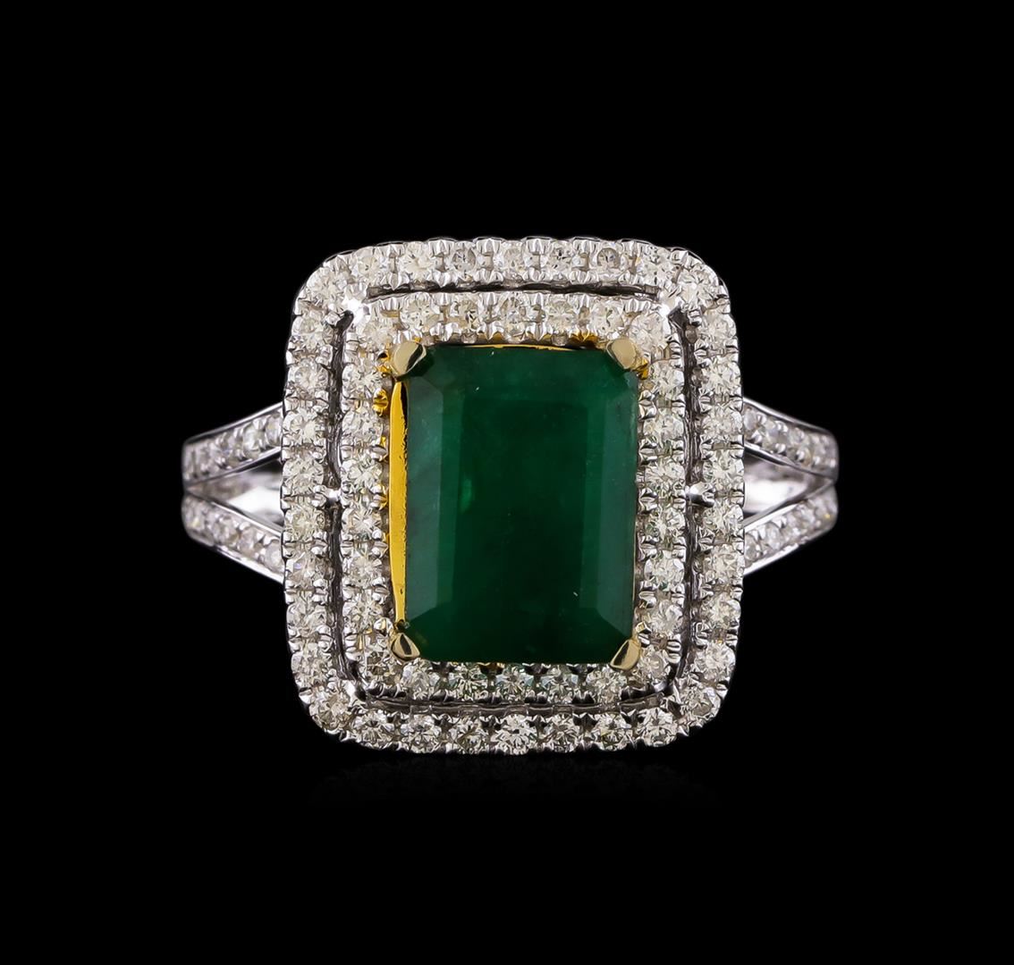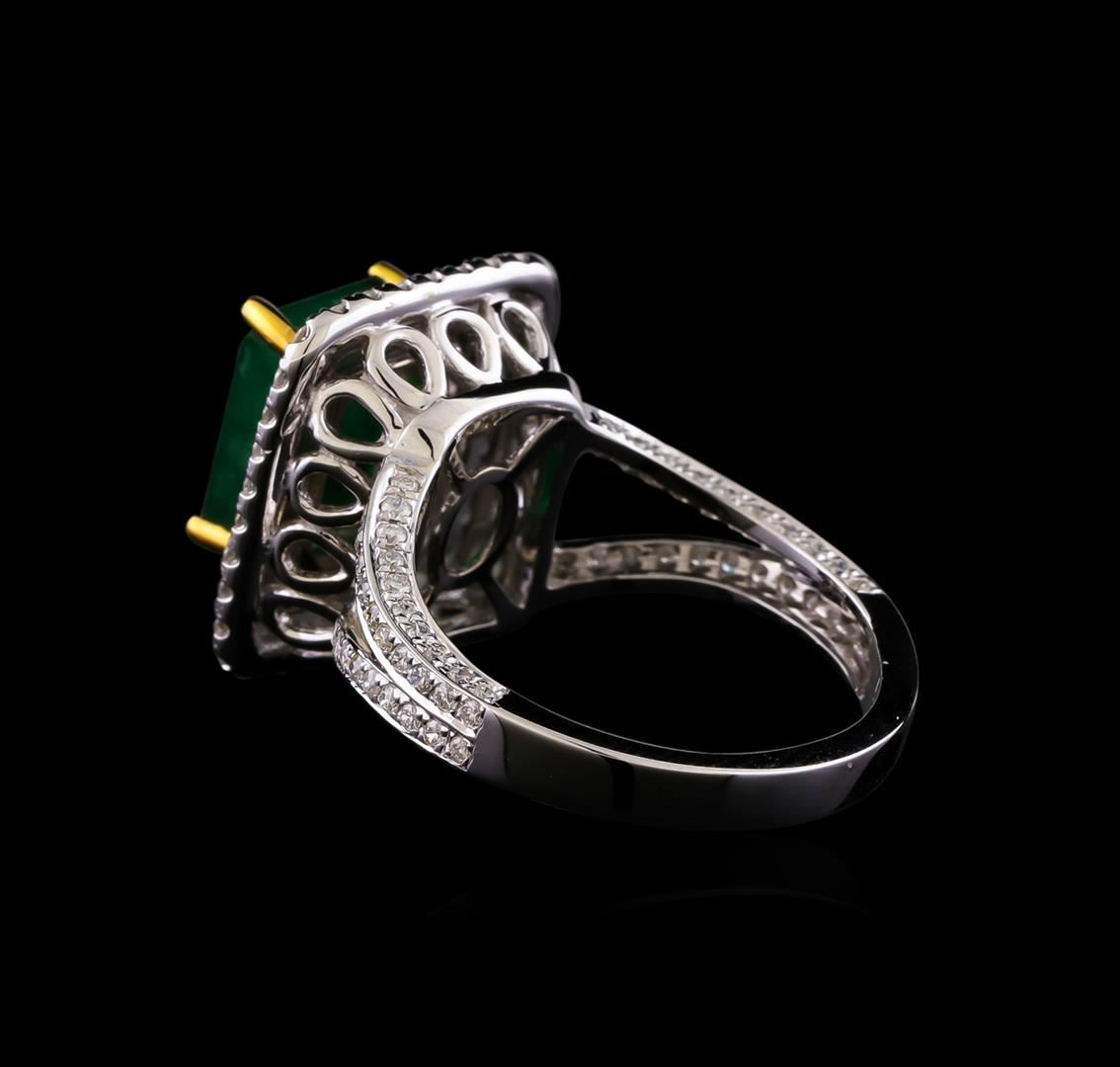 One electronically tested 14KT white and yellow gold ladies combination cast & assembled emerald and diamond ring with a flat shank with a bright polish finish. Identified with markings of "14K". Condition is new. Containing: One prong set emerald standard step cut natural emerald, measuring 9.96 x 7.29 x 4.74mm, approximate weight of 2.53ct., clarity is heavily included, type III, medium dark, moderately strong, green color, (GIA G 6/4), cut is good. One Hundred Two prong set round brilliant cut diamonds, measuring 1.30 - 1.30 x 0.78mm (depth est.) approximate total weight of 102 Stones = 0.82ct. Clarity: SI-2 to I-1. Color: H - I, Cut is Good. Colored gemstones are presumed to have been subjected to commonly used enhancement processes. All diamonds and colored gemstones are graded in the mounting, unless otherwise stated. Total Weight of Colored Stones 2.53ct. Total Weight of Diamonds 0.82ct. Total Weight of Ring 6.80 grams. GGL Appraised at $7,940.00.