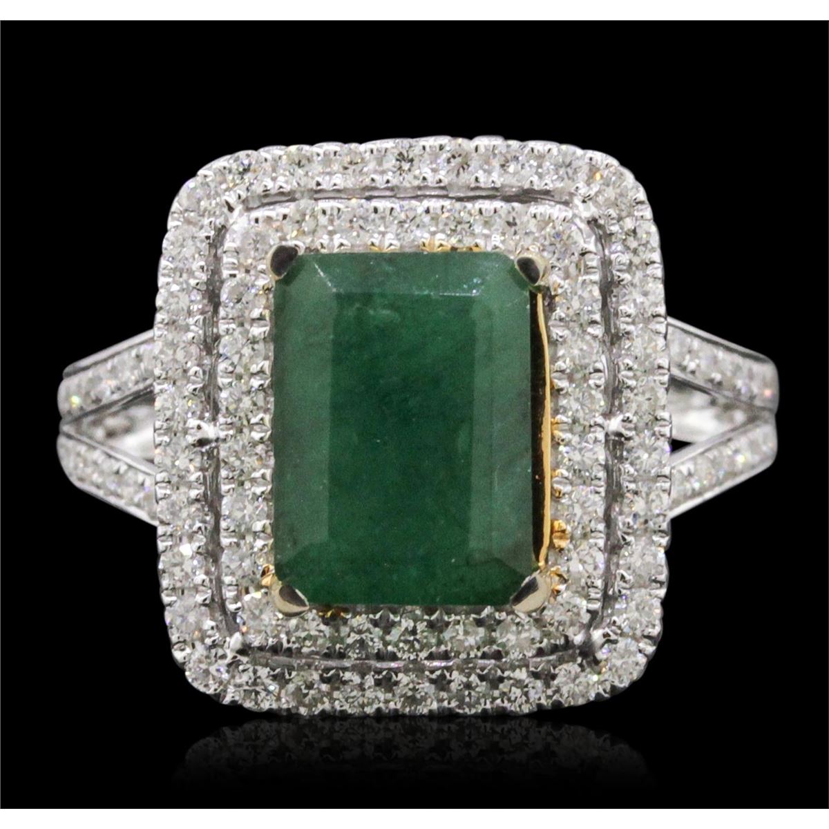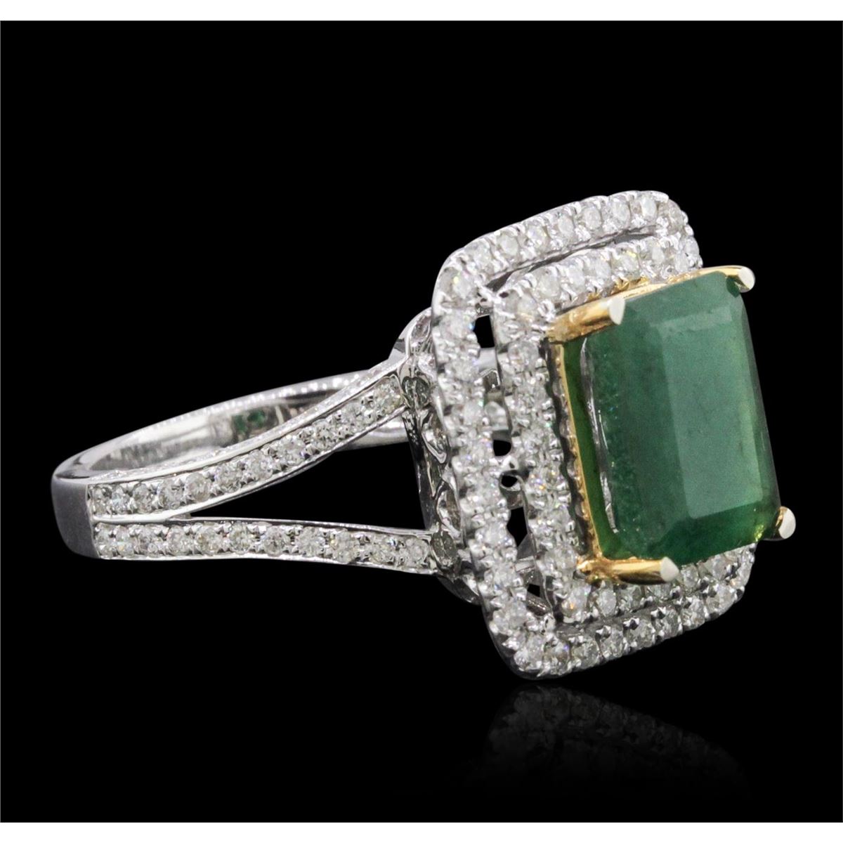 One electronically tested 14KT white and yellow gold ladies combination cast & assembled emerald and diamond ring with a flat shank with a bright polish finish. Identified with markings of "14K". Condition is new. Containing: One prong set emerald standard step cut natural emerald, measuring 9.96 x 7.29 x 4.74mm, approximate weight of 2.53ct., clarity is heavily included, type III, medium dark, moderately strong, green color, (GIA G 6/4), cut is good. One Hundred Two prong set round brilliant cut diamonds, measuring 1.30 - 1.30 x 0.78mm (depth est.) approximate total weight of 102 Stones = 0.82ct. Clarity: SI-2 to I-1. Color: H - I, Cut is Good. Colored gemstones are presumed to have been subjected to commonly used enhancement processes. All diamonds and colored gemstones are graded in the mounting, unless otherwise stated. Total Weight of Colored Stones 2.53ct. Total Weight of Diamonds 0.82ct. Total Weight of Ring 6.80 grams. GGL Appraised at $7,940.00.